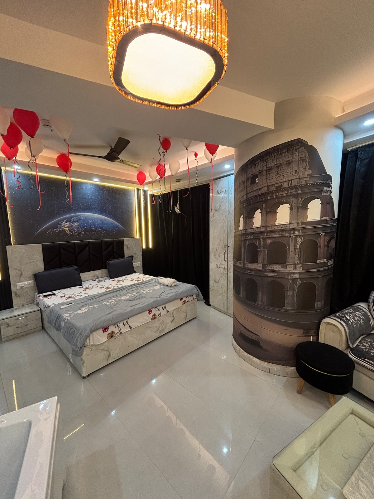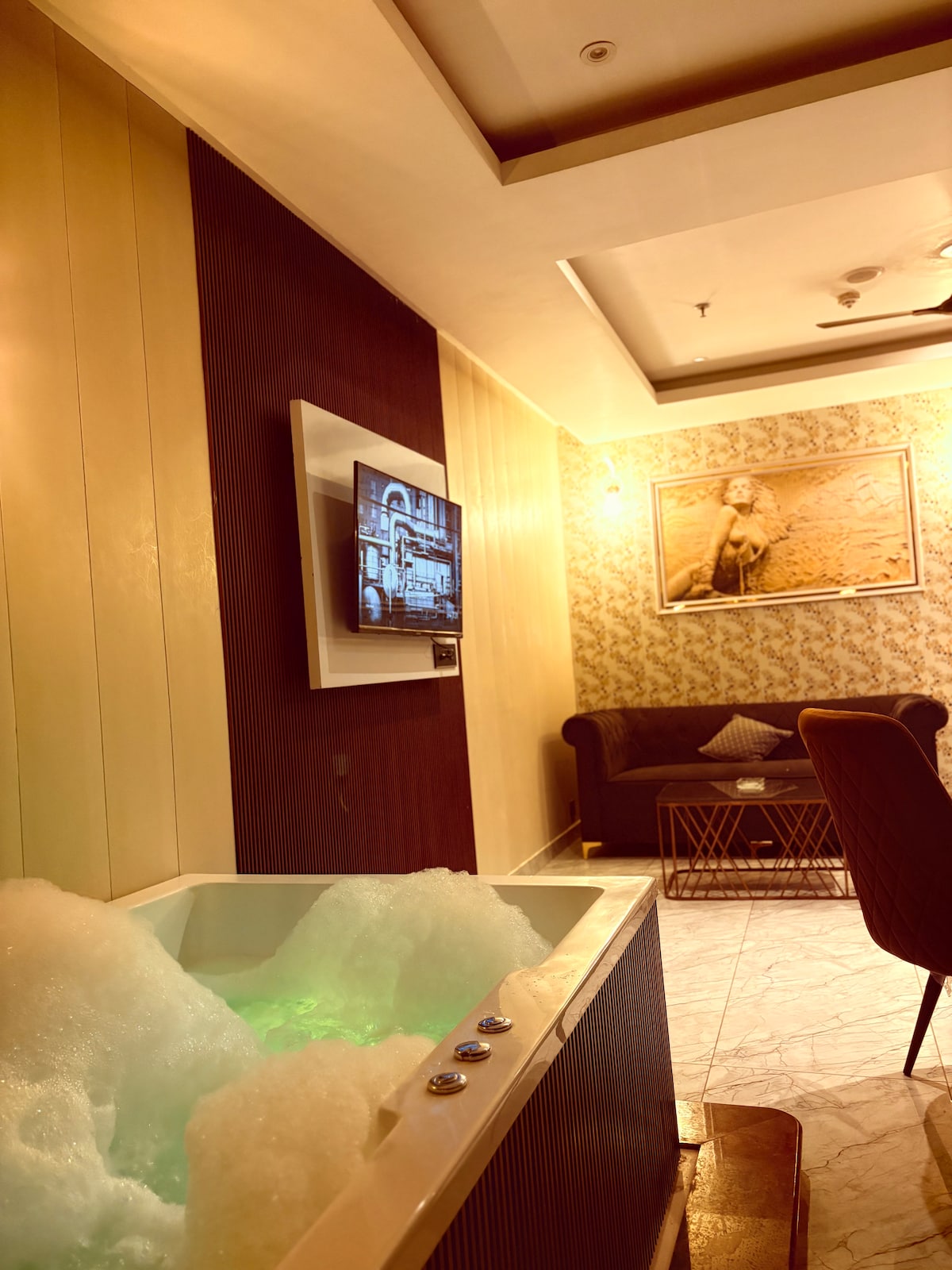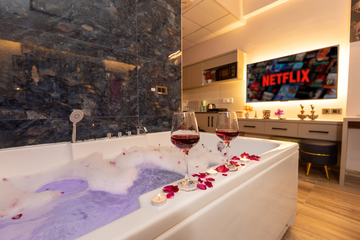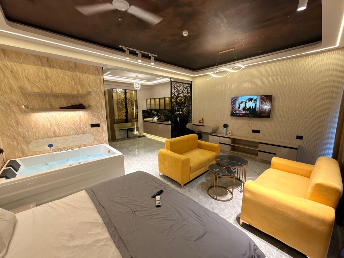 Luxury studio apartment designed for comfort, privacy, and relaxation. Featuring a private in-room jacuzzi, elegant interiors, warm lighting, and a cozy king-size bed, this space is perfect for couples, celebrations, or a peaceful city getaway. Ideal for romantic stays, birthdays, and anniversaries, the studio offers a clean, modern ambiance with essential amenities for a smooth and memorable stay. Relax, unwind, and enjoy a premium experience.