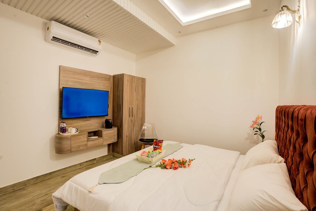 Welcome to a comfortable and modern stay in Sector-63A, Noida. Our newly maintained hotel room is designed to meet the needs of business travelers and couples looking for a peaceful, convenient, and well-connected location. The room features a comfortable bed, clean linens, air conditioning, high-speed Wi-Fi, and a dedicated space suitable for work or relaxation. The interiors are simple, elegant, and thoughtfully designed to ensure a pleasant stay.