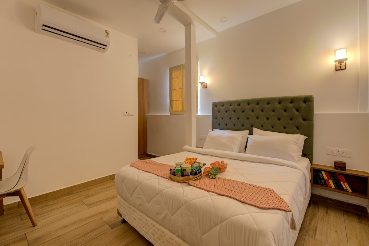 Enjoy a completely private, peaceful stay with zero host interaction. Self check-in, fast WiFi, and a cozy setup designed for comfort & convenience. Whether you're a couple looking for a quiet stay or a solo traveler visiting for work, this space offers everything you need. - Comfortable bed with fresh linens - Attached private bathroom - Geyser - Fully functional kitchenette - 100 Mbps high-speed WiFi - Dedicated work desk - Coffee table and sofa - AC - TV - Power backup