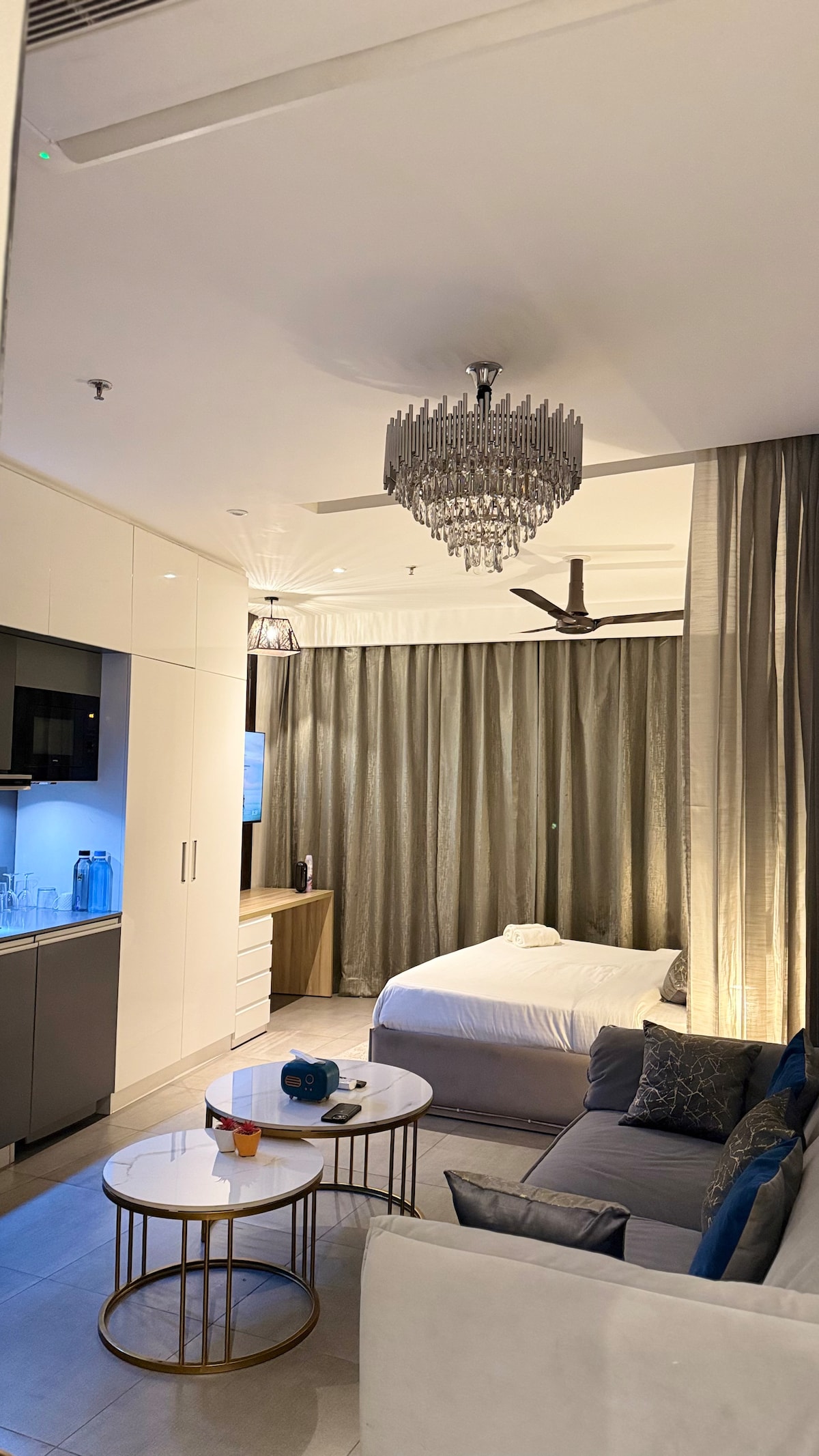 Introducing our exquisite luxury studio apartment: Nestled in the heart of the city, this opulent studio boasts modern elegance and unparalleled comfort. The open-concept design invites you into a spacious haven, bathed in natural light from the large windows that offer breathtaking city views. This apartment is on the 41st floor in one of the tallest sky scraper in Delhi - NCR. The apartment has a river facing view from the balcony!!