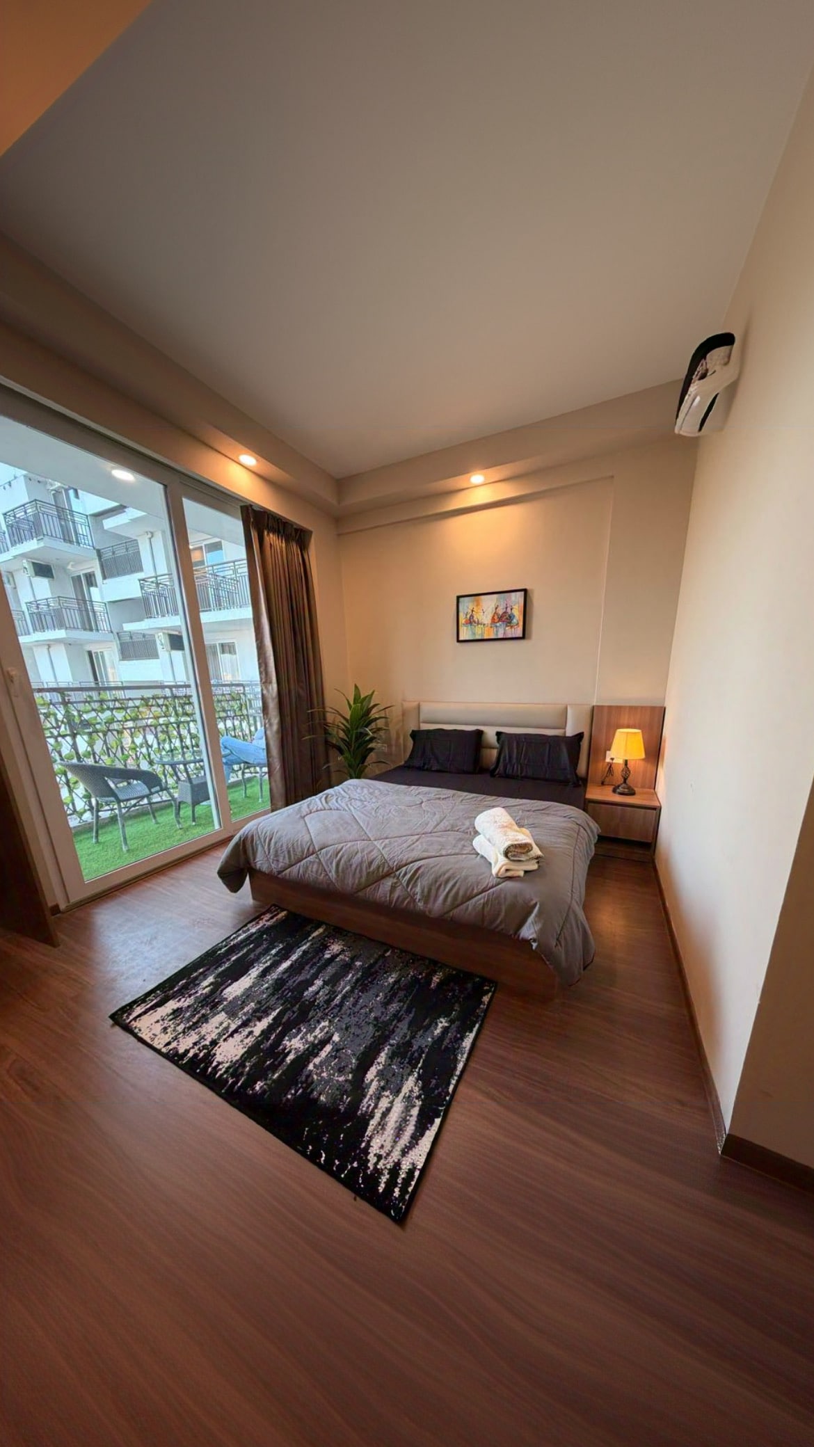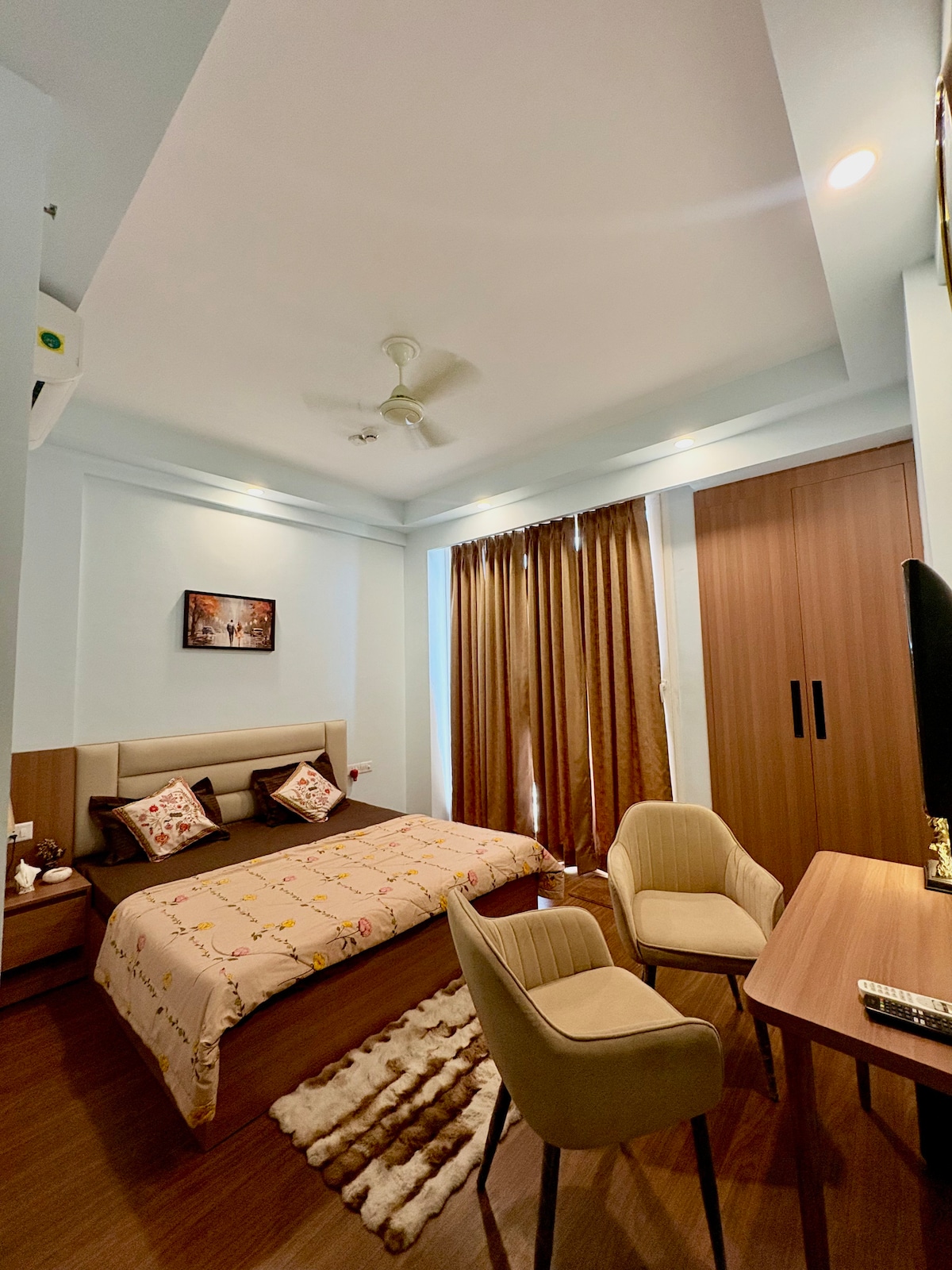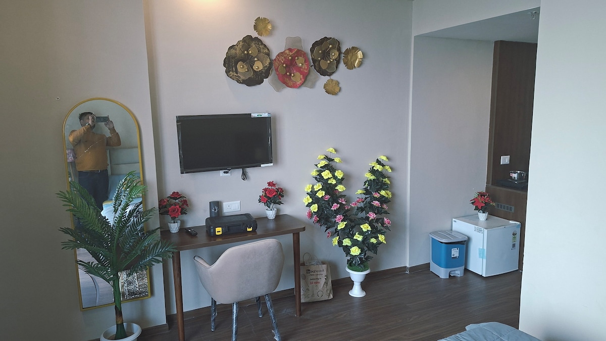 Kick back & relax in this calm & luxurious studio with the warmth of home & the vibe of a high-end hotel. Furnished with a plush King-size bed & modern décor. Amenities: 24/7 Grocery Store Modern Kitchenette High-Speed WiFi & TV Secure Parking outside tower but 24/7 Secured The first 2 floors has commercial shops, offering: Laundry Services Salon Café Medical Store Easy access to the India Expo Mart, Buddh International Circuit. Perfect for couples, solo travellers, or business partners.