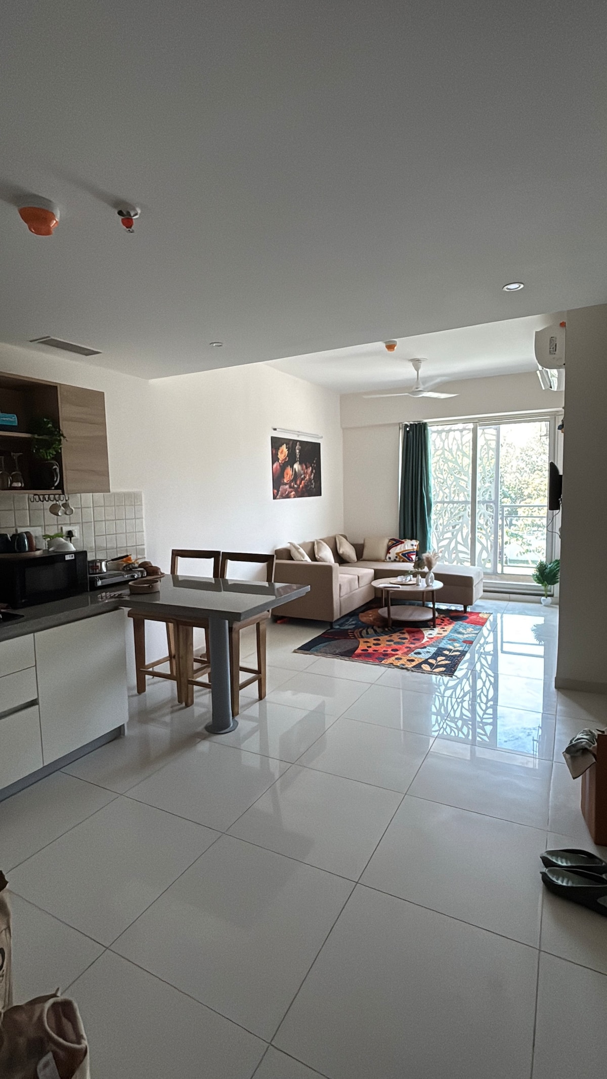 Our newly constructed 2 BHK apartment blends modern comfort with natural charm. The space features 2 serene bedroom with a queen-size beds, a spacious living room, a well equipped kitchen, 2 bathrooms: one attached to the master bedroom and another accessible from the living room and second bedroom and L- shaped balcony offering great view of the city. The property is located near a premium mall in Noida! This well-situated location offers you the convenience of shops, cafes, and entertainment.