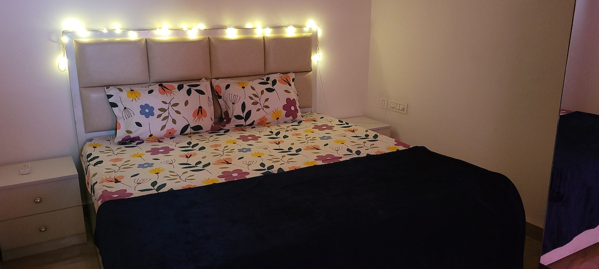 Kick back & relax in this calm & luxurious studio with the warmth of home & the vibe of a high-end hotel. Furnished with a plush King-size bed & modern décor. Amenities: 24/7 Grocery Store Modern Kitchenette High-Speed WiFi & TV Secure Parking outside tower but 24/7 Secured The first 2 floors has commercial shops, offering: Laundry Services Salon Café Medical Store Easy access to the India Expo Mart, Buddh International Circuit. Perfect for couples, solo travellers, or business partners.