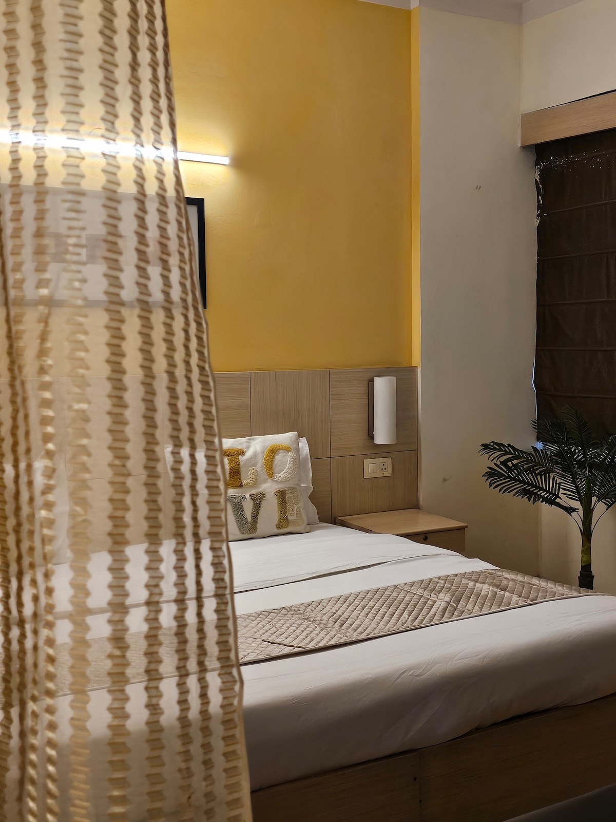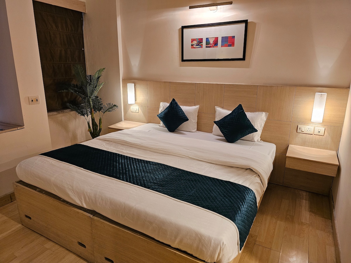 Kick back & relax in this calm & luxurious studio with the warmth of home & the vibe of a high-end hotel. Furnished with a plush King-size bed & modern décor. Amenities: 24/7 Grocery Store Modern Kitchenette High-Speed WiFi & TV Secure Parking outside tower but 24/7 Secured The first 2 floors has commercial shops, offering: Laundry Services Salon Café Medical Store Easy access to the India Expo Mart, Buddh International Circuit. Perfect for couples, solo travellers, or business partners.