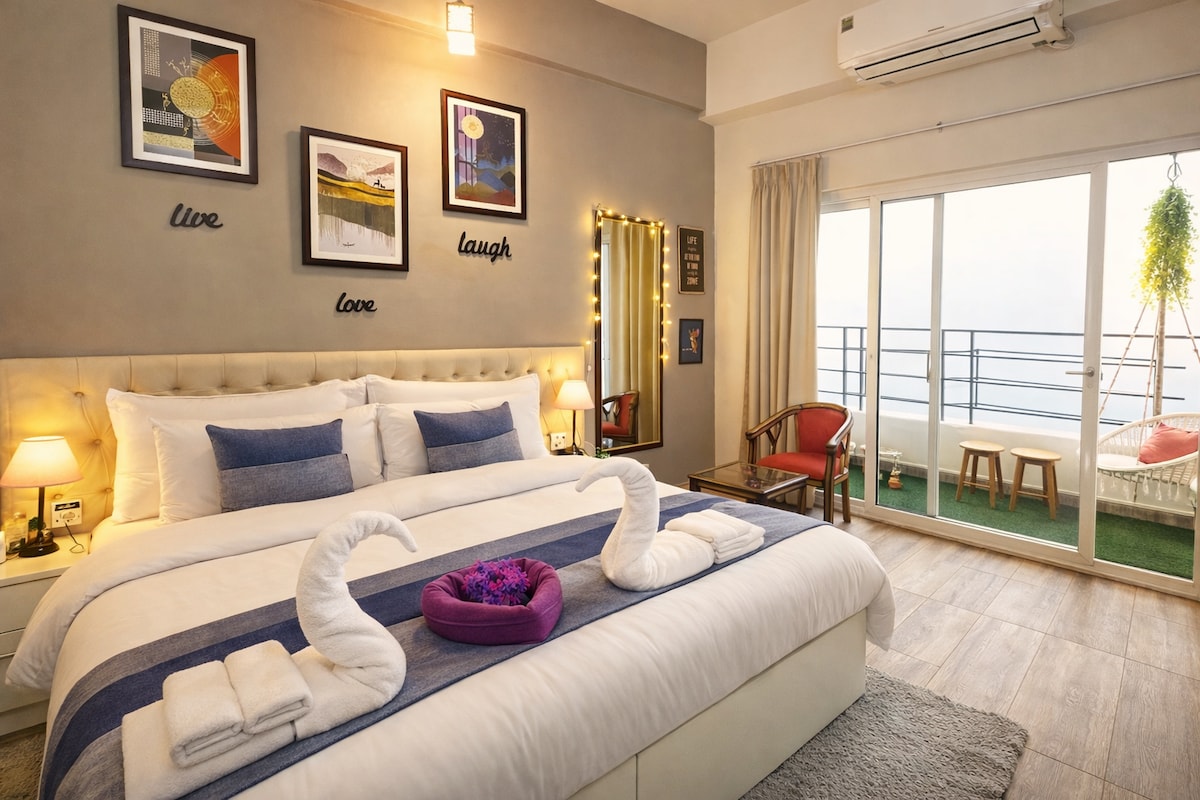 Merakii Hospitality presents: A Space So High, Even Your Problems Get Dizzy! Welcome to our latest masterpiece—a beautifully designed, fully equipped 1RK studio perched on the 31st floor of Supernnova Spira, India's 3rd tallest building. It’s so high up, even birds need a break halfway! This tropical paradise is all yours. With stunning views of the mighty Yamuna River and the sparkling Noida skyline, you’ll feel like you’re living in a postcard... or at least on top of one!