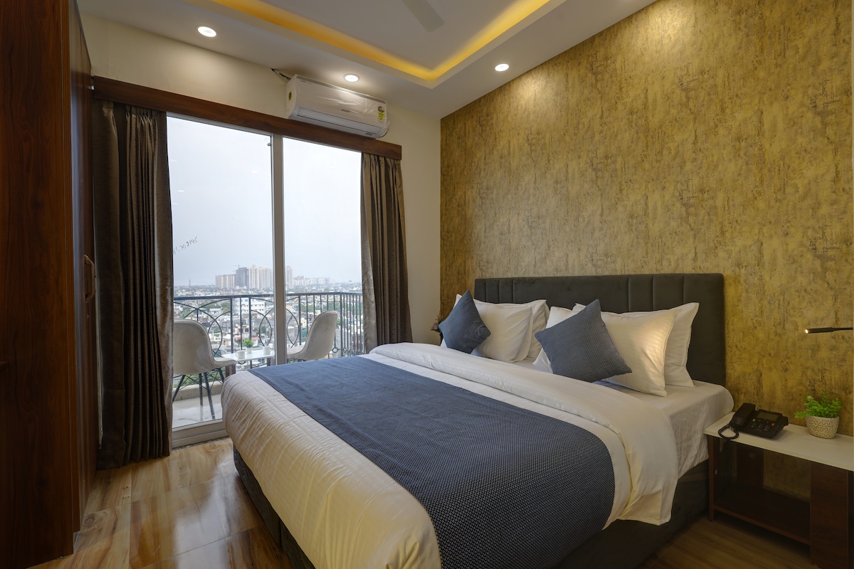 BLUO STAYS - Award winning Homes! Private non-sharing Designer Studio (325 sq ft) at Sector 45 Noida with Terrace Garden, Gym, TT. Top Location - short drive to City Centre, Great India Place & Sector 62/63. Studio has Queen Bed, modern Bathroom, private Balcony with garden chairs, Couch seating & full Kitchen with cooktop, fridge, microwave, cookware etc. All-inclusive Daily Rental - WiFi Internet, Netflix Smart TV, Cleaning, Washing Machine, Utilities, Parking, Power Backup...