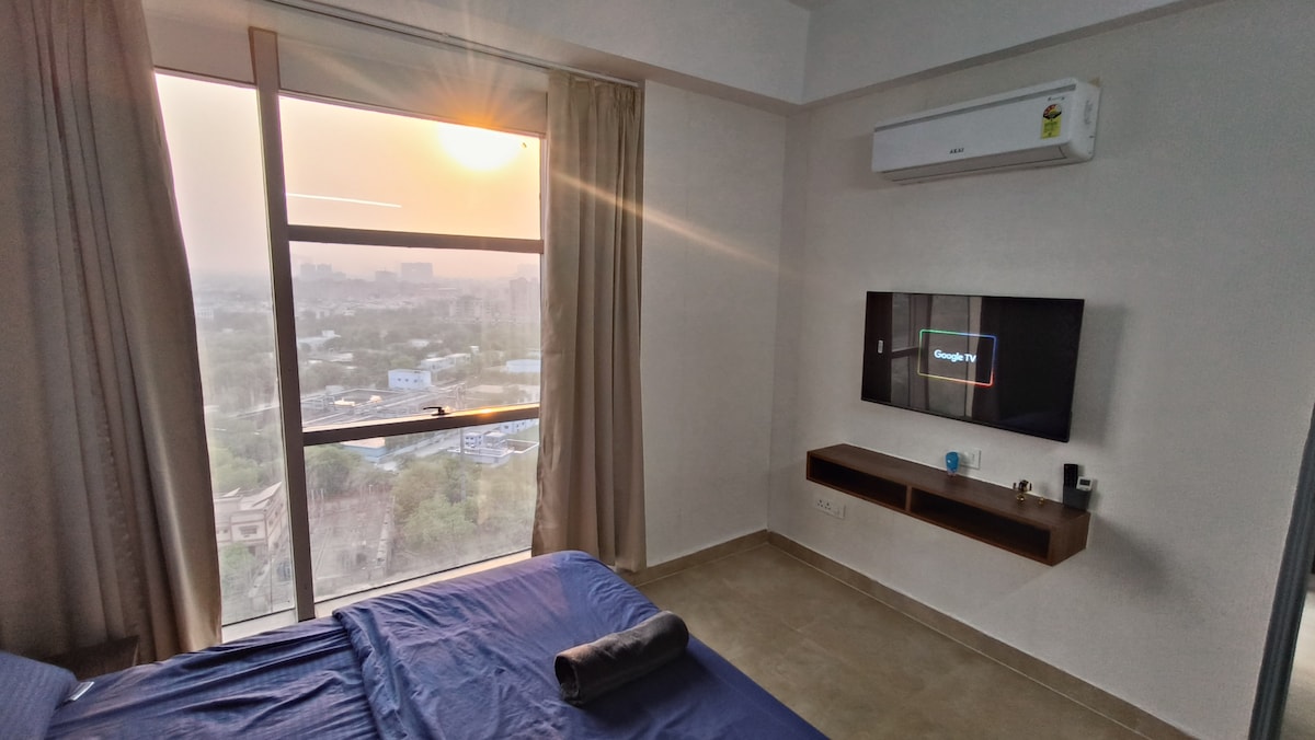 Experience urban comfort in this stylish studio apartment located in a prestigious high-rise near Expo Mart in Greater Noida. Enjoy panoramic city views from the balcony, perfect for unwinding after a day of exploring or business. Inside, the apartment features modern amenities including a fully equipped kitchen, high-speed internet, and a flat-screen TV with streaming services, ensuring a cozy and convenient stay. Take it easy at this unique and tranquil getaway.