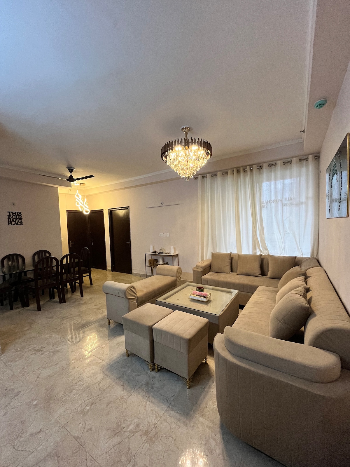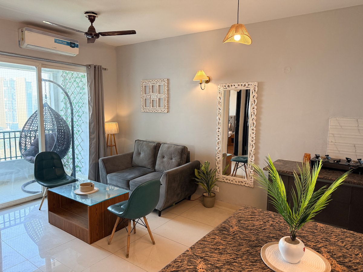Our newly constructed 2 BHK apartment blends modern comfort with natural charm. The space features 2 serene bedroom with a queen-size beds, a spacious living room, a well equipped kitchen, 2 bathrooms: one attached to the master bedroom and another accessible from the living room and second bedroom and L- shaped balcony offering great view of the city. The property is located near a premium mall in Noida! This well-situated location offers you the convenience of shops, cafes, and entertainment.