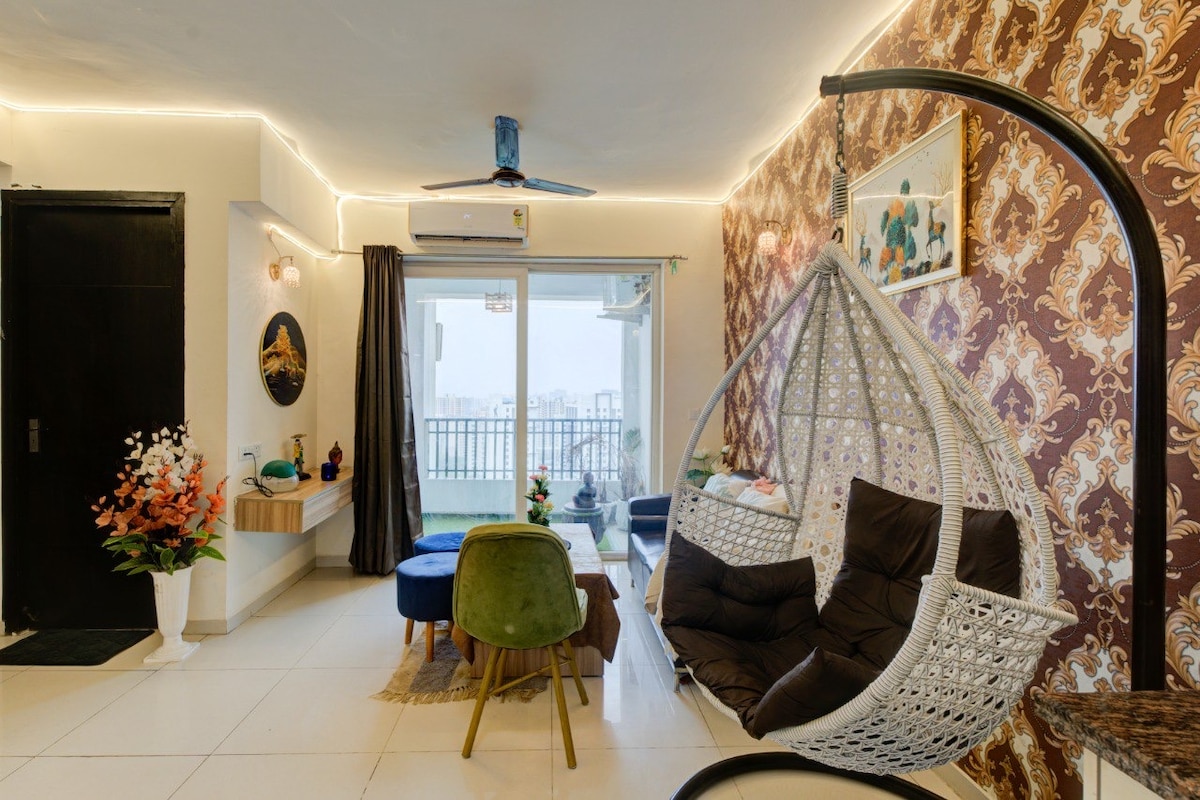 Our newly constructed 2 BHK apartment blends modern comfort with natural charm. The space features 2 serene bedroom with a queen-size beds, a spacious living room, a well equipped kitchen, 2 bathrooms: one attached to the master bedroom and another accessible from the living room and second bedroom and L- shaped balcony offering great view of the city. The property is located near a premium mall in Noida! This well-situated location offers you the convenience of shops, cafes, and entertainment.