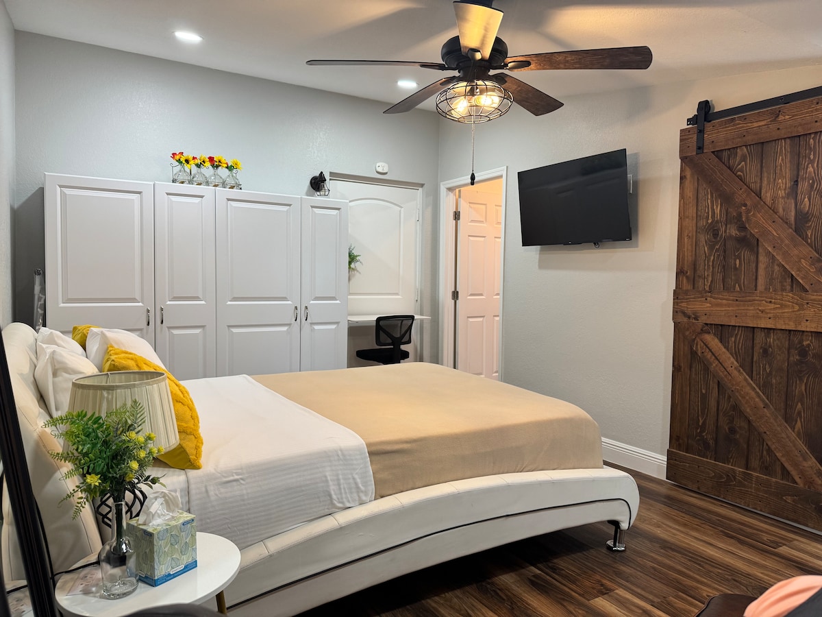 Private modern 1BR apartment ideal for long-term and work stays. Includes 1 bedroom, 1 bathroom, equipped kitchen and small dining area. Features private entrance, private patio, fast Wi-Fi, Smart TV, air conditioning and free parking for two cars. Quiet and comfortable for professionals, nurses or students. Convenient location near airport, hospitals, shopping and main roads. We are available 24/7 through the Airbnb app. Monthly discounts available for extended stays and corporate booking.