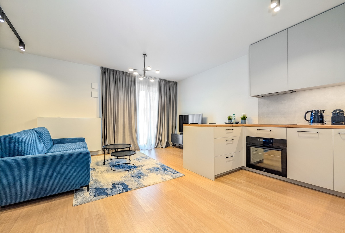 PLEASE NOTE: IN JANUARY 2026 THE POOL AND SAUNAS WILL BE CLOSED FOR MAINTENANCE! The apartment consists of a large living room with a kitchenette, a dining area and a desk. The large bedroom is equipped with a 160x200 cm bed. The 2nd bedroom is equipped with a designer bunk bed. Both 120x200 cm. Guests of the apartment can use the swimming pool, dry and wet sauna, salt and ice caves, a small gym for free and, for a fee, a closed, large gym and a luxurious SPA zone.