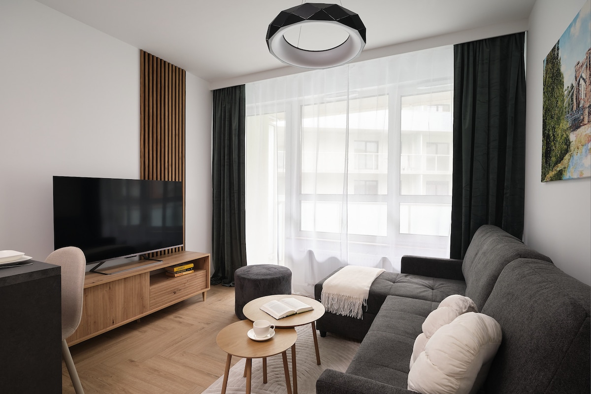 PLEASE NOTE: IN JANUARY 2026 THE POOL AND SAUNAS WILL BE CLOSED FOR MAINTENANCE! The apartment consists of a large living room with a kitchenette, a dining area and a desk. The large bedroom is equipped with a 160x200 cm bed. The 2nd bedroom is equipped with a designer bunk bed. Both 120x200 cm. Guests of the apartment can use the swimming pool, dry and wet sauna, salt and ice caves, a small gym for free and, for a fee, a closed, large gym and a luxurious SPA zone.