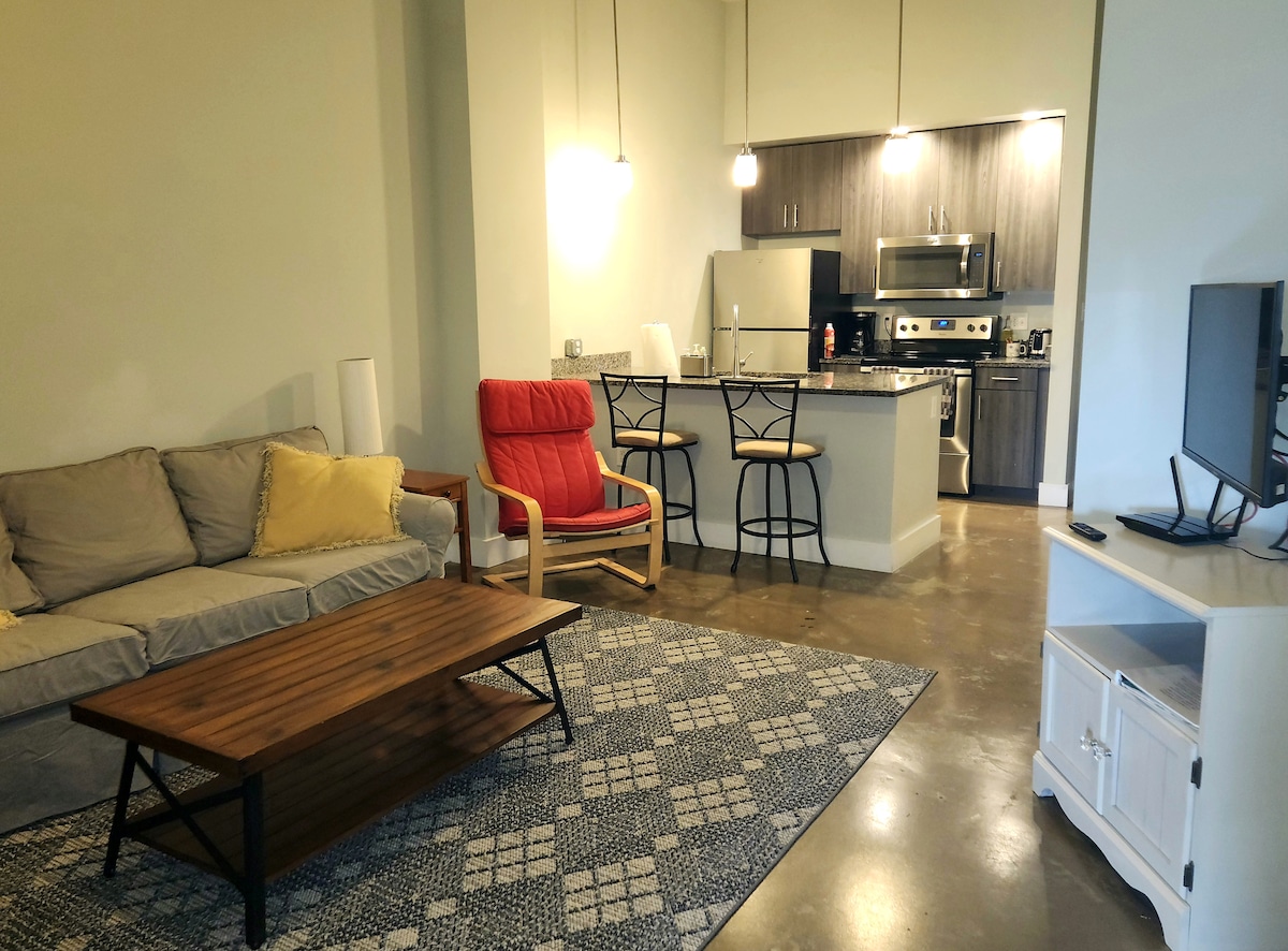 Primary guest must be 25 years old. We greet all guests in person upon arrival, you will be required to present a valid government ID to make a copy of for our records. Centrally located, newly renovated warehouse features 110 year old tin ceilings, heart pine floors, new amenities include granite counters, stainless appliances, central air/heat, ceramic tile baths, dishwasher, in-unit washer. Late check-in available, 6-10pm for $30 fee. Early check (if available) can be arranged for a $20 fee.