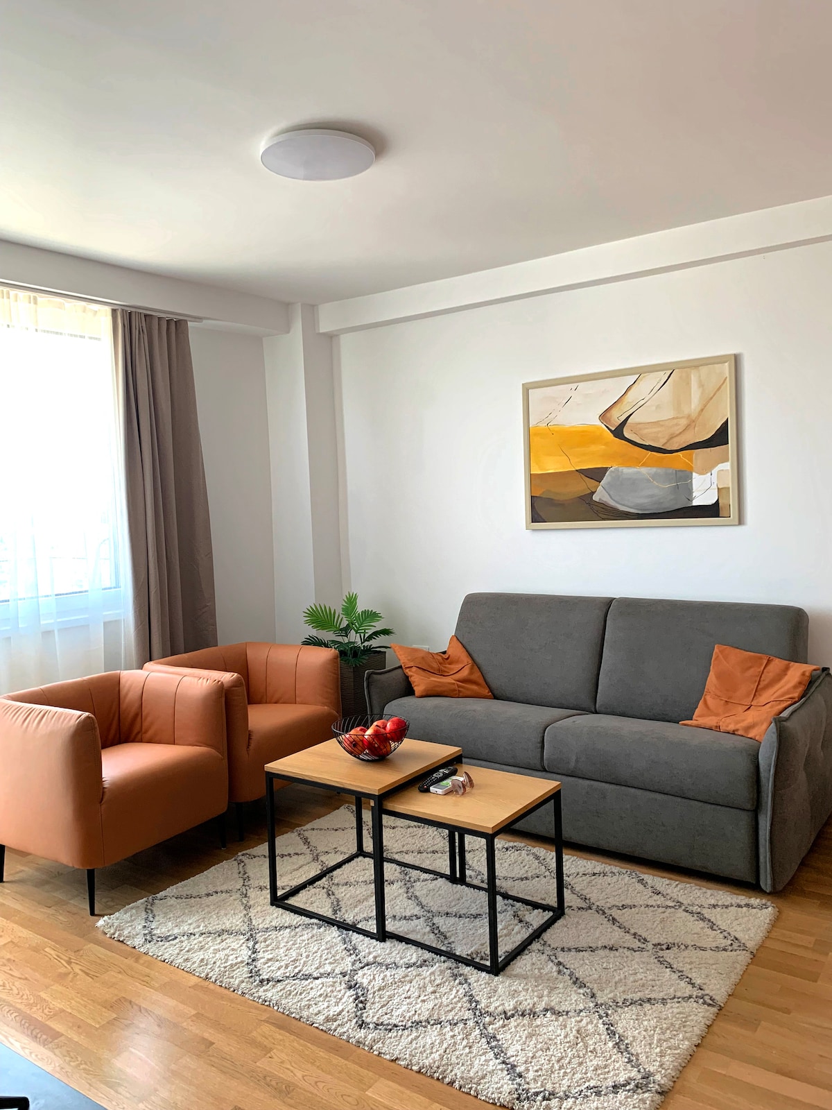 Modern, one-bedroom apartment with balcony, fast Wi-Fi, A/C and free parking. Easy walk to the Main Square, Old Bazaar, malls, cafés and restaurants. Perfect for digital nomads and travellers who can enjoy stylish, clean and peaceful stay! Sleeps 3 (queen + sofa bed), with full kitchen (oven, stove & dishwasher), bathroom (shower, washing machine, towels) and balcony. ✈️ We offer airport transfers for extra comfort (additional cost). Stay 10+ nights get one-way free, 14+ nights both ways free!
