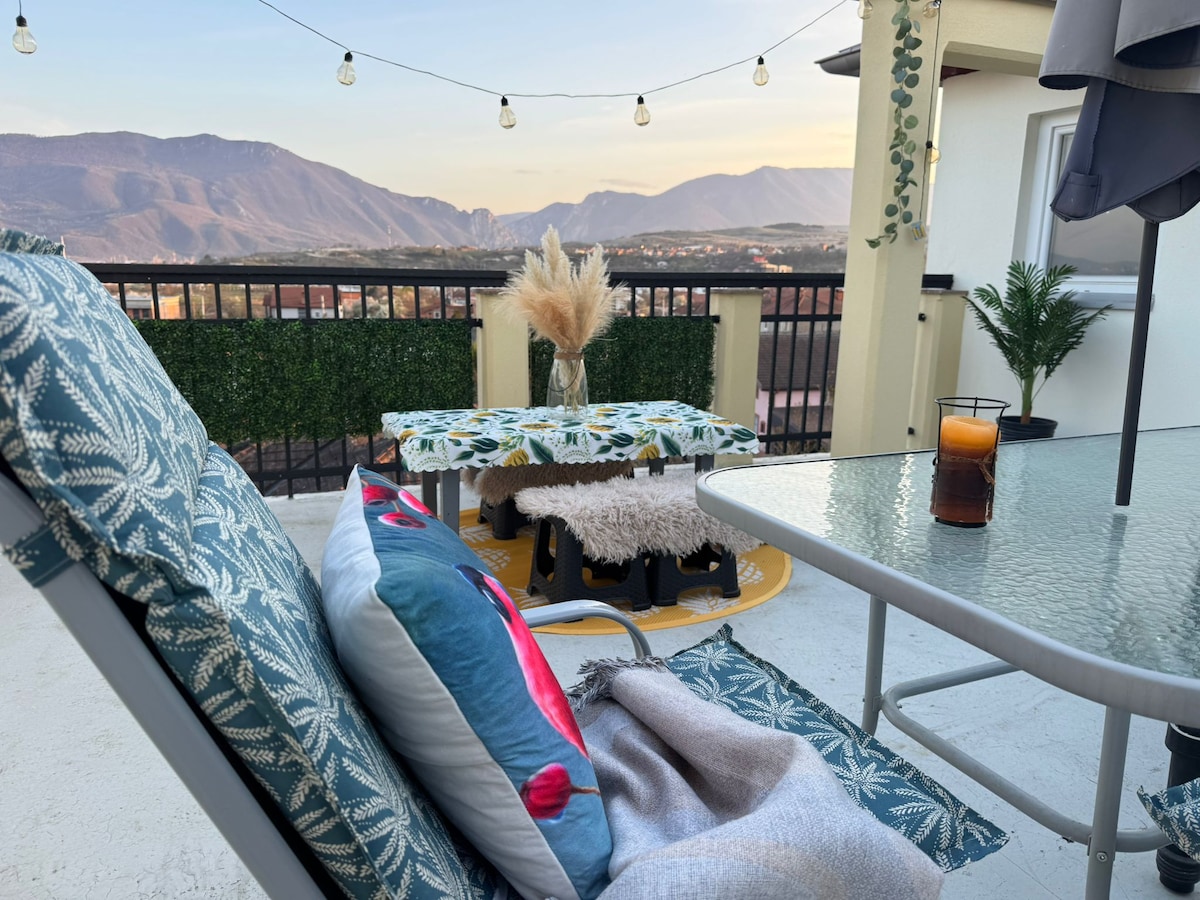 Located in the Skopje area (Kondovo), close to Matka Canyon, this home offers a 35 m² private rooftop terrace with panoramic views. Enjoy sunny mornings and relaxing evenings under the open sky. Spacious home on 3 levels with a bright 65 m² living area and open-plan kitchen, plus an extra lounge. 2 bedrooms (1 queen bed and 3 single beds) and a sofa bed for 2. Modern bathrooms, extra toilet, and private garage.