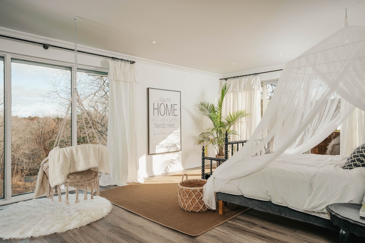 Welcome to the LOFT - A private, eclectically designed spa-inspired unique stay in the historic Webb Schoolhouse, less than an hour from Toronto. Featured in TORONTO LIFE, this private loft includes a sauna, unique hanging bed, wood stove, kitchenette and is filled with art, and huge tropical plants as well as a projector & giant screen for epic movie nights. Relax and recharge, roam the grounds and enjoy the beautiful outdoor spaces, the permaculture farm, animals, and fire pit.