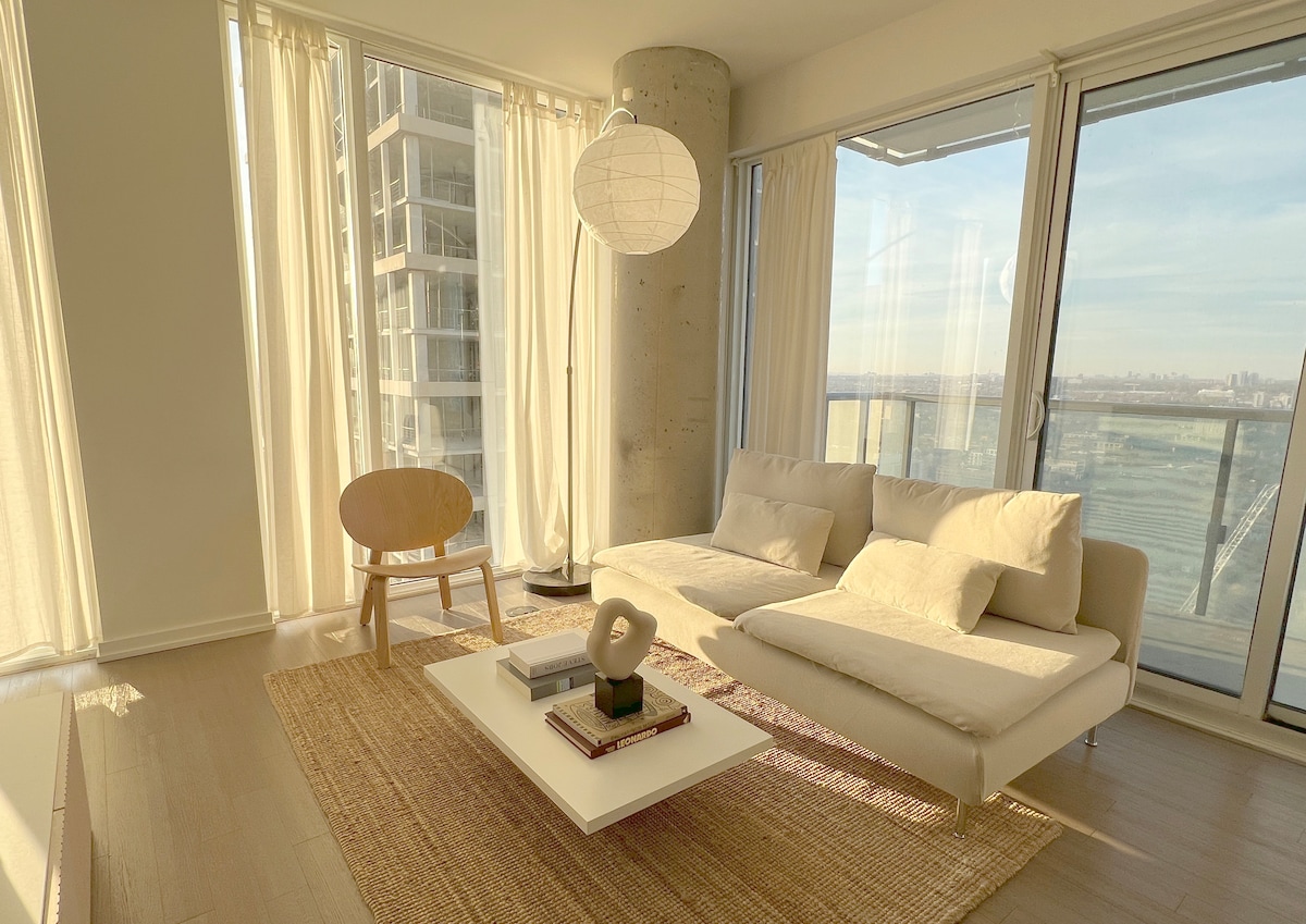 A bright and stylish urban loft in the heart of downtown! This sun-filled suite features soaring 12-ft ceilings, stunning floor-to-ceiling windows, and sleek hardwood floors. Relax on the oversized sofa, dine at the modern table, and cook in the fully stocked kitchen with stainless steel appliances. Sleep soundly on a plush Westin Heavenly queen bed, and refresh in the spa-like marble bathroom. Includes in-suite laundry, high-speed Wi-Fi, and an unbeatable location near vibrant King Street West!