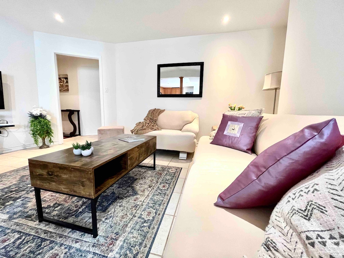 Welcome to New Toronto! Driveway parking included next to entrance. Large -Cozy basement apartment in lakeshore village, Lake Ontario is at the end of the street. Beautiful skyline view of downtown Toronto , Full kitchen with stove and oven. Large dining room table. Comfortable L- shaped couch. One bedroom with queen size bed. Washer , dryer, laundry facility. WiFi Netflix, Prime video, Book a month or longer stays , bring your pet.