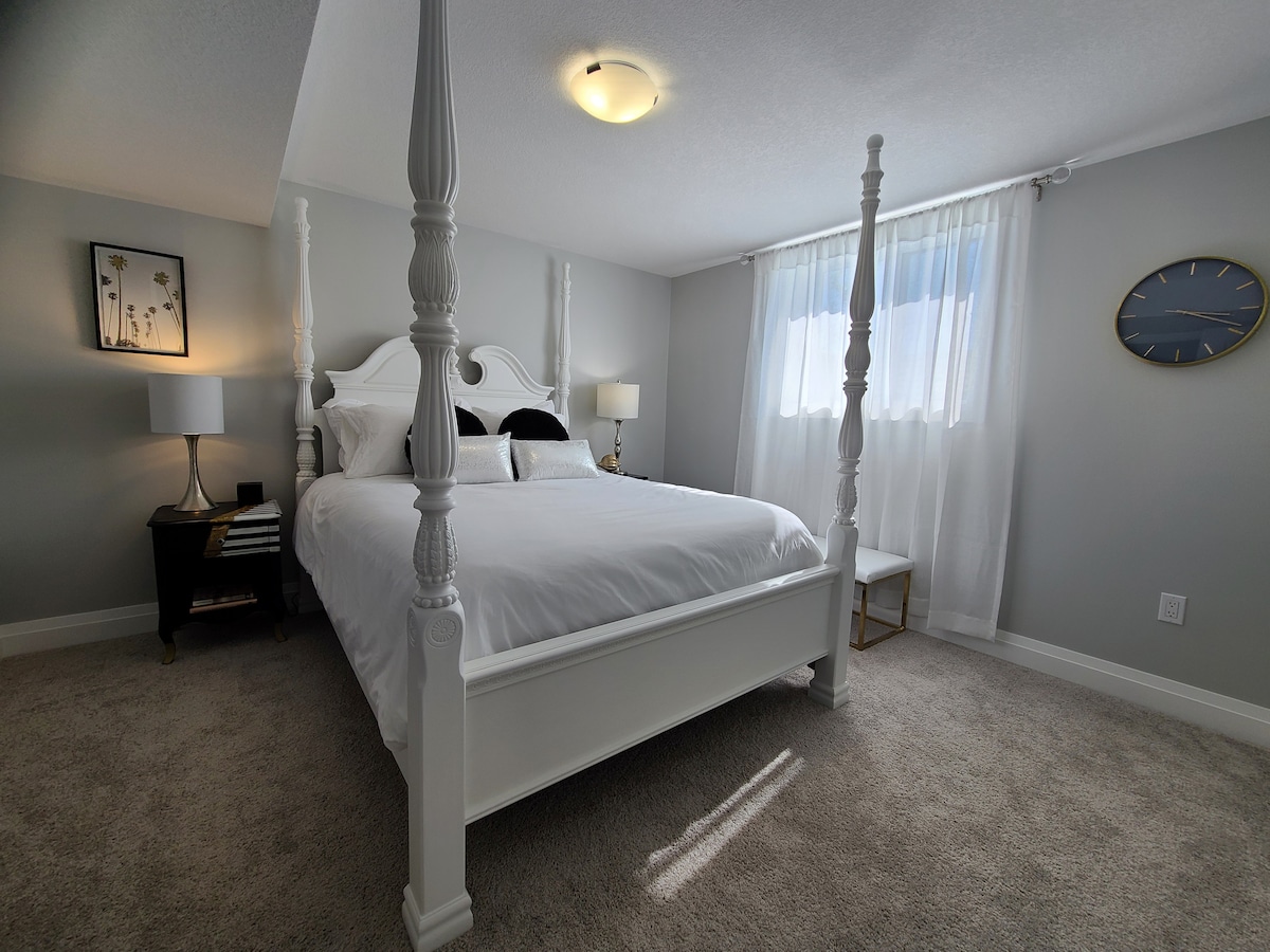 This beautiful couples retreat is a 900 sq. ft., 1 bedroom upper apartment located in the heart of downtown Collingwood. Steps to shops and restaurants and a short drive to all the major ski hills in the area. Featuring, vaulted ceilings, sectional couch and 65” TV. The kitchen comes complete with all cooking needs and dishes supplied, a breakfast bar and dining area, Master bedroom with a King size bed, 5-piece ensuite, 2 piece powder room with laundry and door to large outdoor deck.