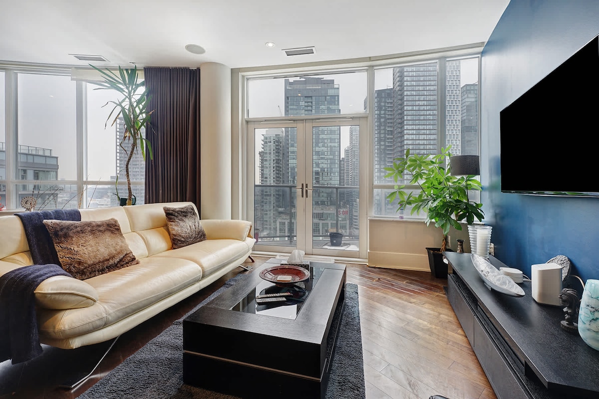 Welcome to my home! My 1400 sq ft luxury townhouse is conveniently located in the heart of the entertainment district and is near all of Toronto's main attractions! It has 2 beautiful bedrooms with 3 full bathrooms, as well as a sofa bed providing lots of space for up to 6 guests. It's fully equipped with everything you'll need including a Smart TV, high speed WiFi, parking spot, and condo amenities such as a gym and hot tub.