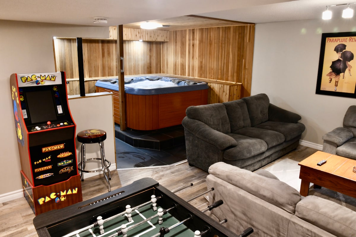 This Ski in/out chalet is only 13 min walk to the nearest Ski Lift. We have an outdoor Hot Tubs, an indoor Sauna, and Entertainment such as a Pool Table, video games and a large 75 inch HD TV for your movie nights. Surround your friends/families around our renovated Kitchen, large Centre Island and large Dining Room Table. Seat in our covered Sunroom to have a morning coffee or enjoy your BBQ food all year round. Worry free and leave your cars at our home: Only 7 min walk to the Village