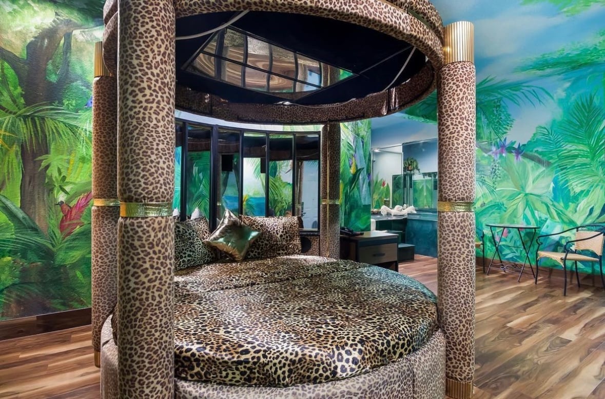 主题按摩浴缸套房,配圆形床和热水浴缸!