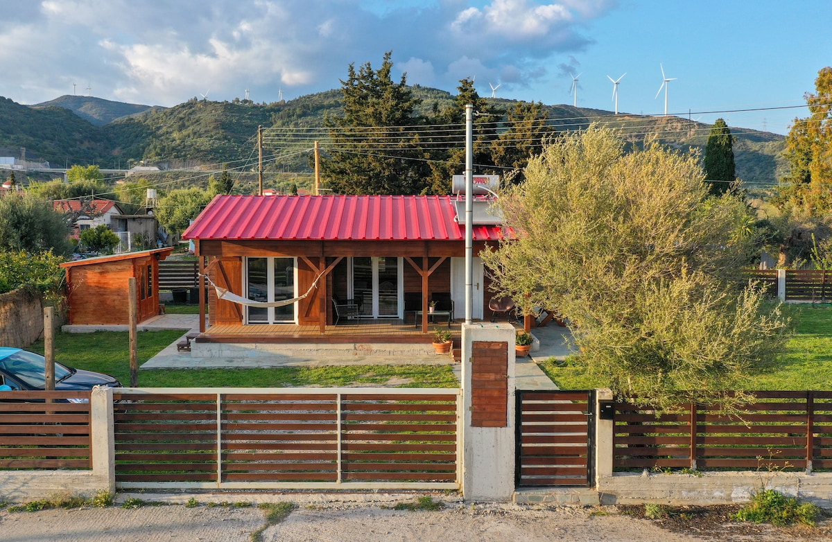 Ένα ξύλινο σπίτι 45 τ.μ. σε περιφραγμένη και δεντρόφυτη έκταση 2 στρεμμάτων με καλλωπιστικά δέντρα και φυτά, αμπελώνα, κήπο με λαχανικά, μεγάλους χώρους με γκαζόν καθώς και κιόσκι με ψησταριά. Δημιουργήστε αναμνήσεις σε αυτόν τον μοναδικό χώρο που είναι κατάλληλος για οικογένειες με παιδιά ή για χαλάρωση με την παρέα σας μακριά από τους ήχους της πόλης. Επίσης τα κατοικίδια σας είναι ευπρόσδεκτα. Η απόσταση από το κέντρο της πόλης ειναι 5 χλμ και από τον Μύλο των Ξωτικών 4 χλμ.