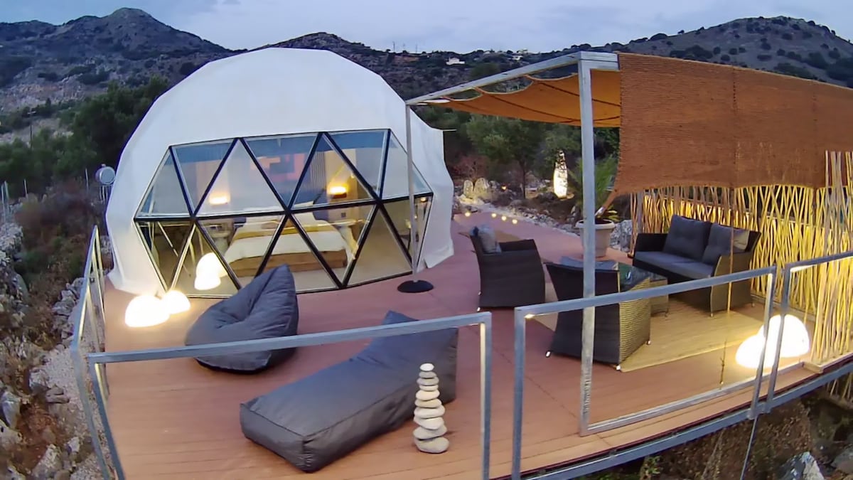 Nestled close to the serene village of Kalyves, our dome Kailani offers a sustainable getaway with breathtaking views of the Mediterranean Sea. Combining the adventure of camping with luxurious amenities, the dome offers a unique accommodation with creative design.