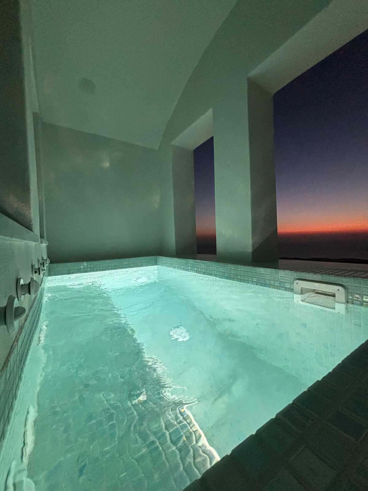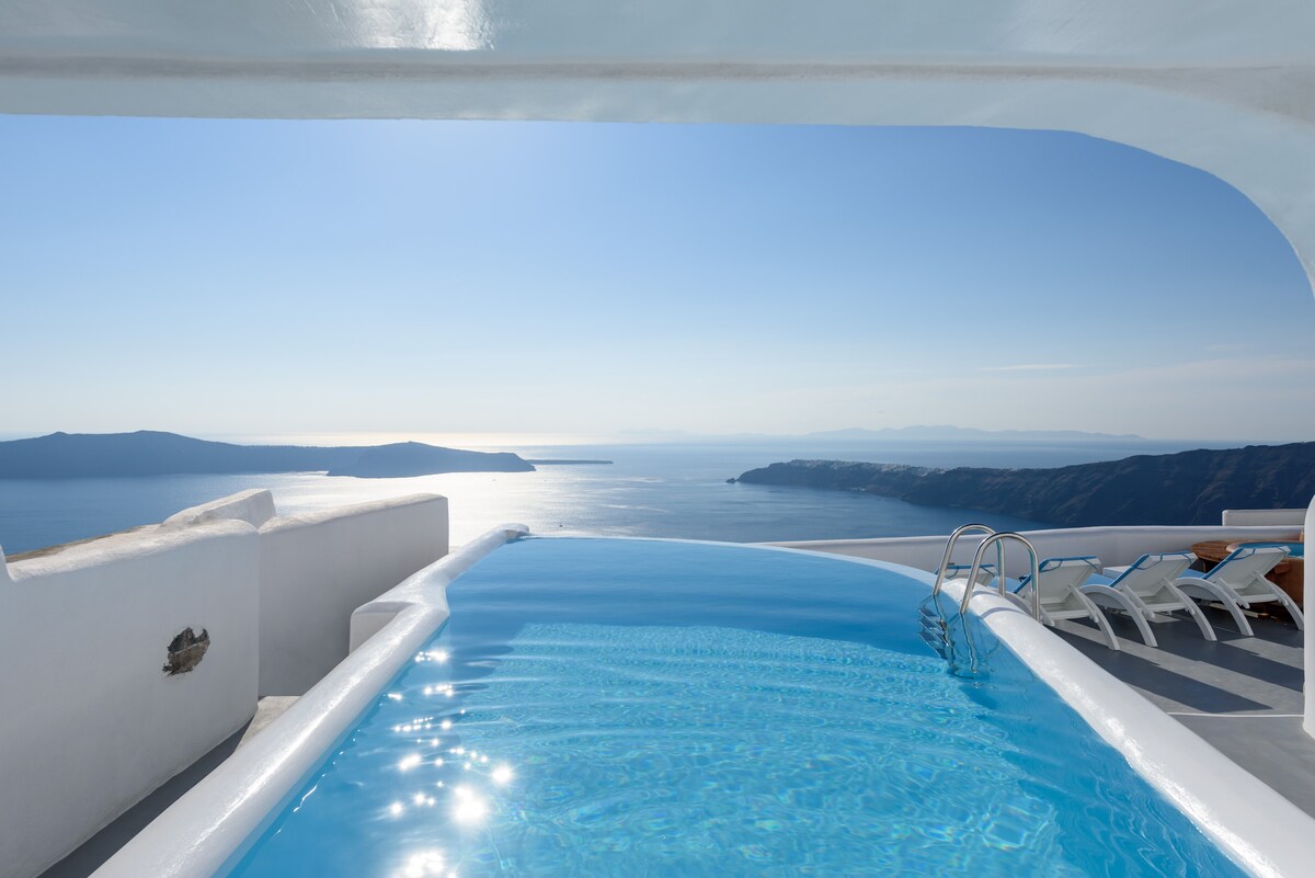 Junior Caldera Sea & Sunset View is located on the TOP of the caldera rim at Imerovigli overlooking the ocean (Aegean Sea), the well-known Caldera, the Volcano, the other nearby Cycladic Islands and the famous Sunset. This listing has a private and spacious for 2 people outdoor Jacuzzi/mini pool/ hot jet tub and cannot accommodate kids under 4 years old.