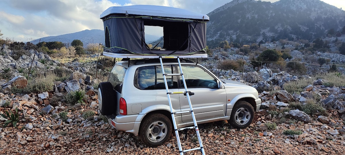Give yourself a unique opportunity to explore mountains and beaches with no restrictions. An unforgettable experience creating memories for a lifetime. Take your bed with you and enjoy your holiday all year round, especially autumn and winter.Possibility of transport from Chania airport or Souda port upon consultation. The car has manual transmission.Have in mind that the assembly and disassembly of the tent requires two people.For drivers under the age of25 there is an additional insurancecost.