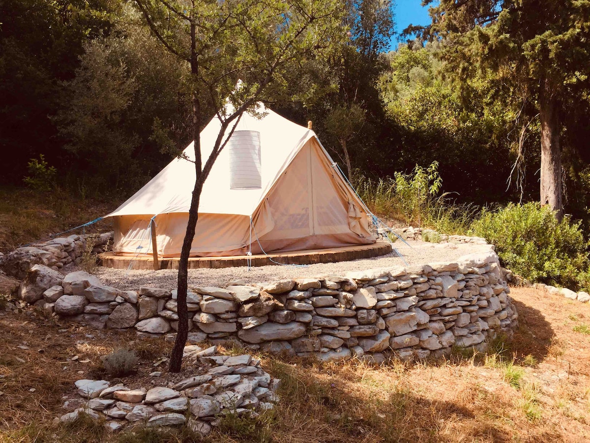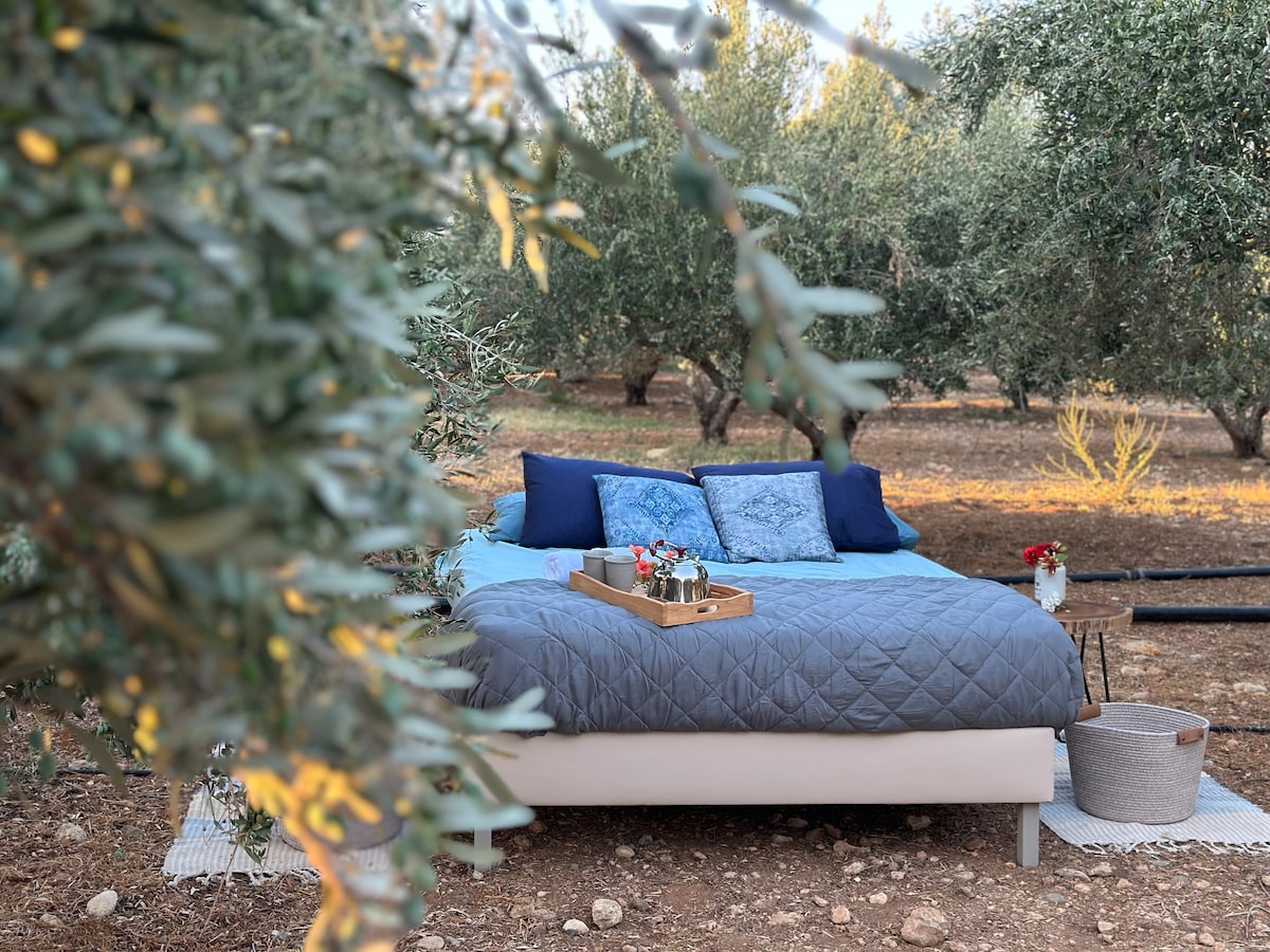 The bell tents are nestled between pistachio and olive trees. The bell tents are equipped with plush bedding, electricity and electric sockets with a plethora of usb ports, a pedestal fan and a clothes-hanger. We guarantee protection from nature creatures - mosquitos and bugs don't stand a chance with the 360-degree mesh wall and the mesh door. The luxurious shared toilets and showers are located just a few meters away from the tent. There is a private area with a picnic bench and a hammock.