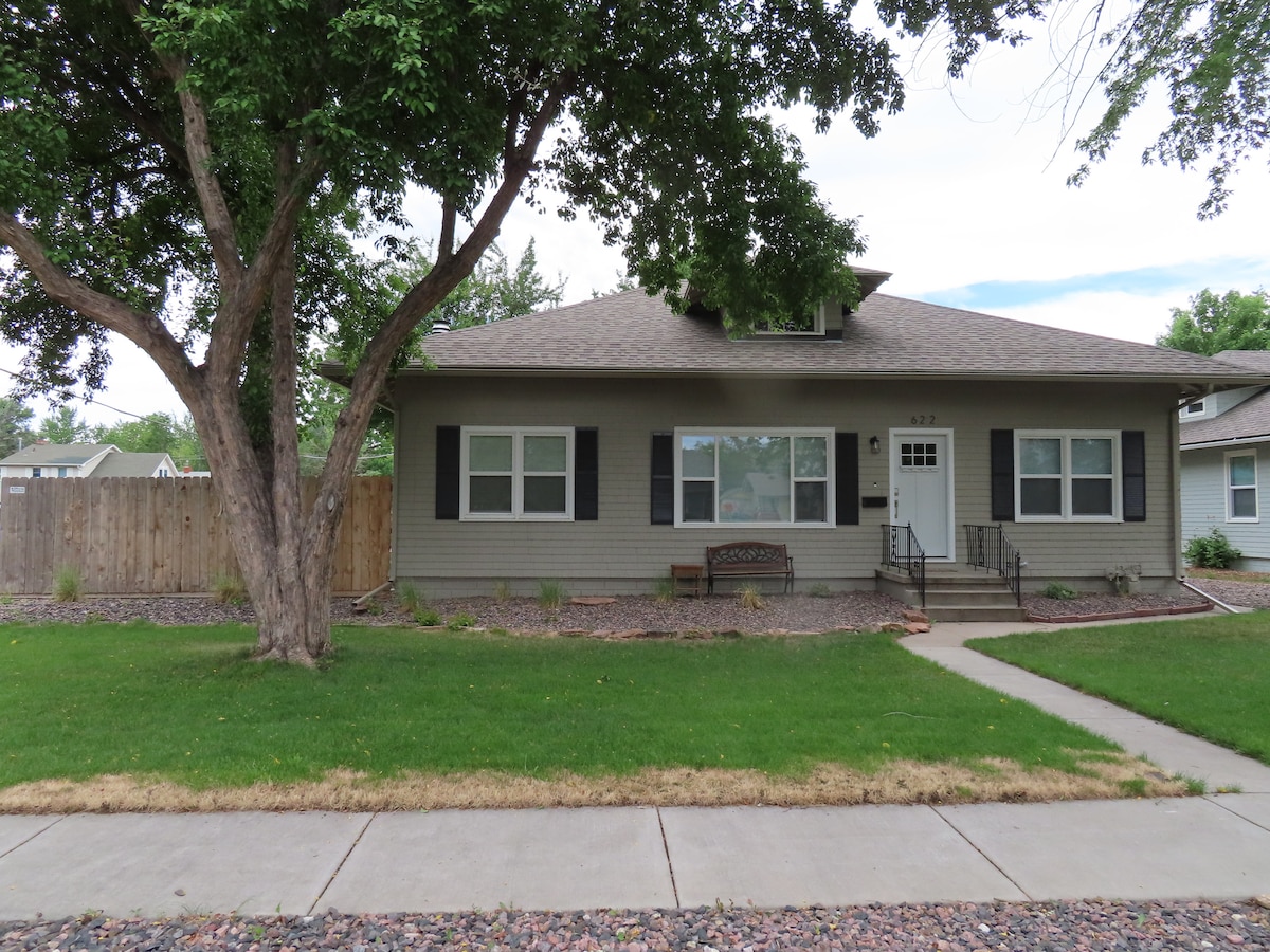 We hope you will fall in love with this spacious bungalow in the heart of Loveland. It has been completed updated with all the modern amenities yet still has a great vintage vibe.There are 10 ft ceilings, large rooms and everything is newer. All furnishings were carefully hand-picked with comfort and style in mind, with several one of a kind pieces from local artists. It is on a large corner lot in a quiet area yet is walking/biking distance to shopping, theatre, restaurants,rec center and more.
