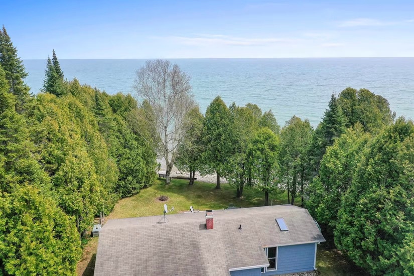 Beautiful 4 season, private 2 bedroom Knotty Pine Cottage located on the shores of Lake Michigan just 10 yards away from water in Sturgeon Bay, WI. 2 BR/1 bath cottage with beautiful stone, wood burning fireplace. A fully equipped kitchen with high bar dining which seats 8. Lots of living space with leather sectional and full size hide-away sofa sleeps 2, Main Guest Room 1 w/ queen log bed and Guest Room 2 with full size log bunk beds, Large screen tv, wifi and panoramic lake view.