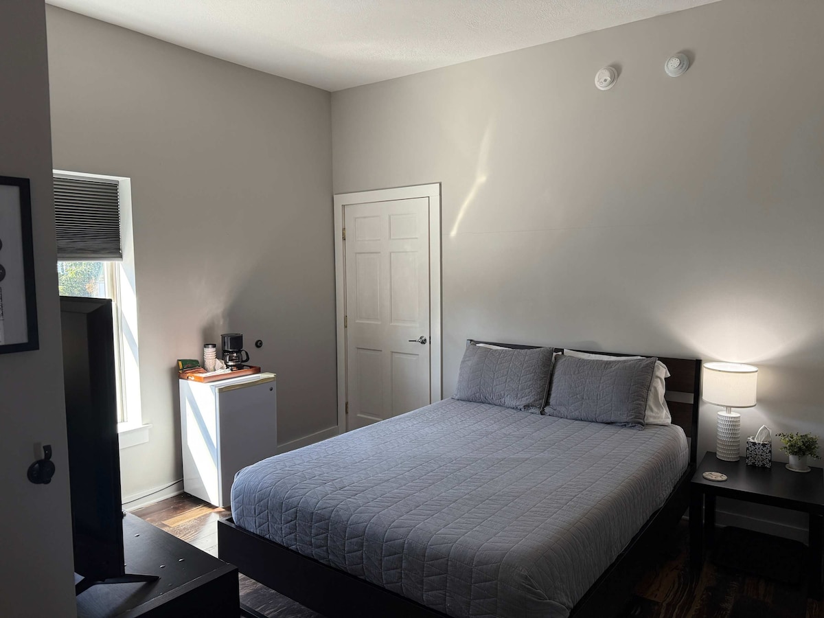 This is one of 18 rooms in the charming Holiday Music Motel, a 1950s "retrovated" motel featuring plush-top mattresses, high-quality bedding and towels, free wireless Internet and cable TV, flat-screen smart TVs, in-room fridge and coffee maker and more. Original Simmons furniture in all guest rooms, common area classic diner-style breakfast nook for guest use 24/7, original tiling and iconic neon sign are just some of the highlights lovingly preserved at the motel.