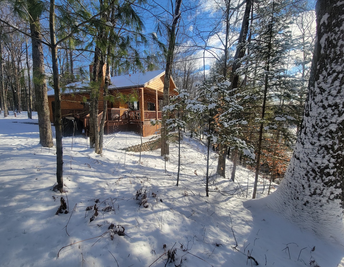Thompsonville Lodge is a spacious log lodge home. Your family will love the spacious accommodations for up to 12 with 8 beds, 2 full and 1 half baths. - Outdoor Hot Tub - Outdoor wood burning sauna - Loft with log queen/queen bunk bed - 75" TV w/ Sonos Surround Sound, YouTube TV, Netflix, Disney+ & Spotify - Gas fireplace for ambience and heat - High quality mattresses - Log ski & snowboard rack - Heated garage - Polywood outdoor and Solo Stove firepit - Well stocked kitchen