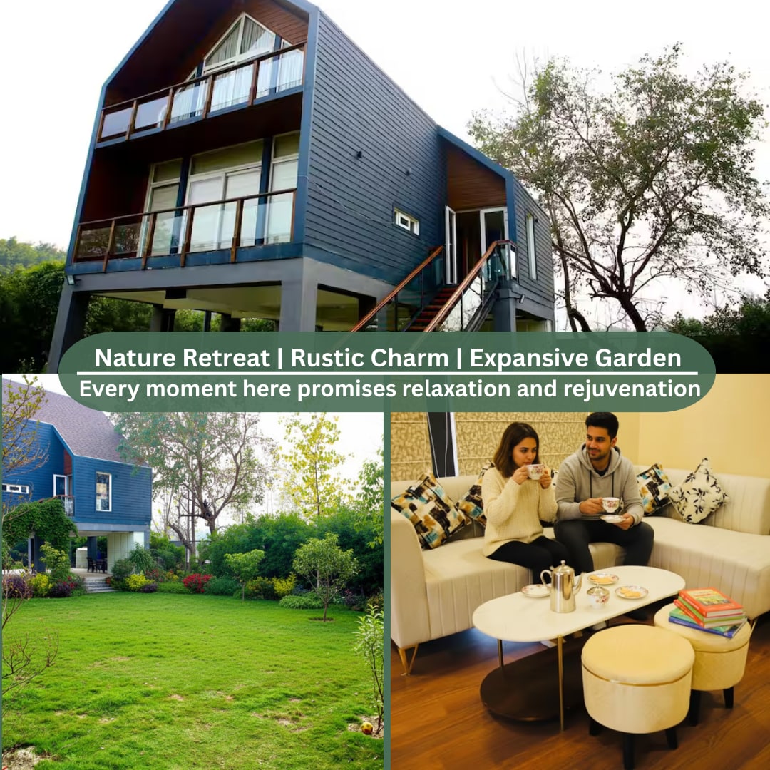 Nestled amidst lush greenery, The Blue Cabin is a serene getaway to reconnect one with nature. This exclusive villa blends comfort with rustic charm, offering a tranquil retreat for families and small groups. With an expansive garden and a thoughtfully designed cosy interior, every moment here promises relaxation and rejuvenation. Whether you're looking to sip tea in the garden area, enjoy a peaceful evening under the stars, or host an intimate gathering,The Blue Cabin is your ideal getaway!