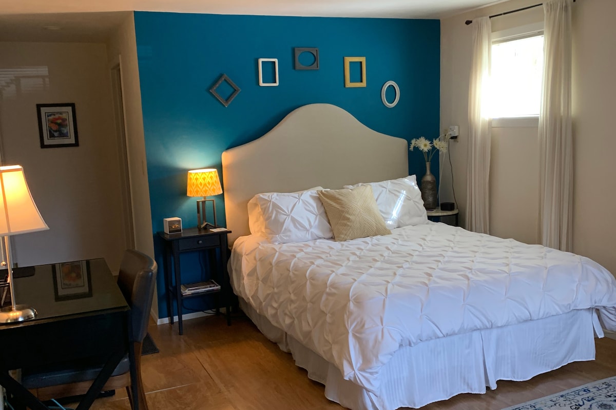 Half a block from Green Lake Park, this bright, charming, comfortable basement studio has its own private entrance and bathroom, as well as a free, dedicated off-street parking space. Short walks to restaurants, bars, shops & outdoor activities -- and the lake! -- in the vibrant, popular Green Lake neighborhood. (Plus, I use hypo-allergenic detergents for linens.) As of May 2025, we have brand-new flooring, newly painted walls and heated floors in the bathroom, as well as a heated towel rack!