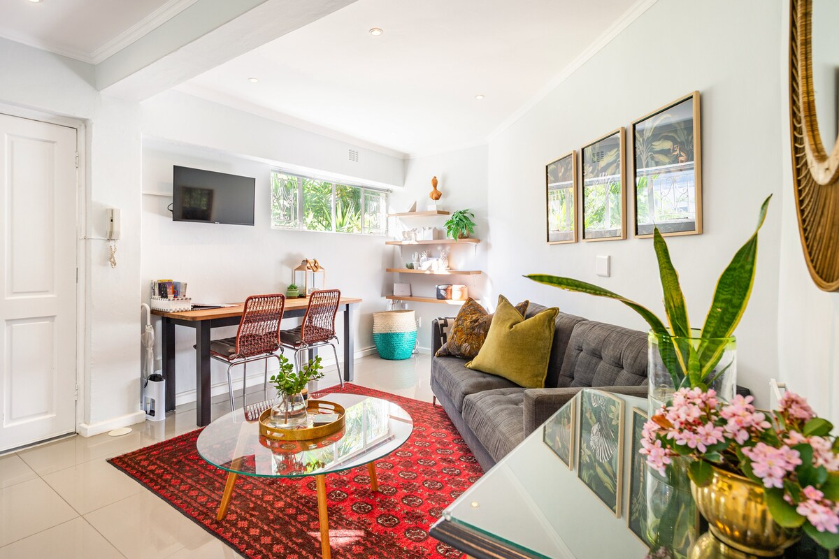 Whimsical accessories, funky appliances, and vibrant soft furnishings add lavish bursts of colour to this quiet, contemporary apartment. Admire the breathtaking backdrop of Signal Hill before a leisurely stroll across the park to the ocean and the beach front promenade. Unlimited Wi-Fi and Netflix for your enjoyment. The apartment is renovated and refurbished with new appliances, furniture and linen. The space is quiet and tranquil and perfect to relax or work away from the buzz. Free uncapped WiFi is included. The entire apartment and common areas will be available to residents. We shall gladly assist our guests with any questions and suggestions they may have. The flat is within easy walking distance of the Cape Town Stadium, parks, the promenade, many buzzing restaurants, deli's, bakeries and the famous V&A Waterfront. The MyCiti bus stop just steps away gives quick access to the rest of the city. Within walking distance of the Green Point Park & Stadium, V&A Waterfront, Graduate School of Business UCT (GSB), gyms, restaurants, shops, deli's (Giovanni's being a favourite) and pubs. Apart from taxi and shuttle services being available, it is on the MyCity bus route. Ample street parking is available as well as a Free Public Parking Area across the street. It is only 2,6km from the CBD and Cape Town International Convention Centre-CTICC-approximately 5 minutes in peak traffic times. There are a few steps in the garden path leading to the apartment while the apartment itself is on one flat level with no internal stairs.