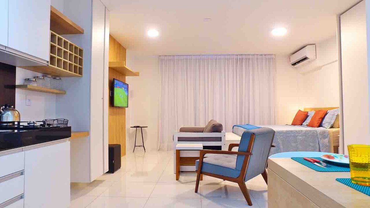 Apartamento-estúdio aconchegante situado na Ponta Verde, bairro nobre de Maceió. Localizado à 300m da praia, 650m da feirinha de artesanato da Pajuçara, 1,8km das piscinas naturais de Maceió e próximo a bares, restaurantes, supermercados e shoppings, está no coração de Maceió. O estúdio inclui Smart TV, wifi e banheiro privativo com chuveiro, secador de cabelo e ferro elétrico, enquanto a cozinha tem micro-ondas, geladeira, fogão, cafeteira ,sanduicheira, panelas,pratos, xícaras, taças vinho.