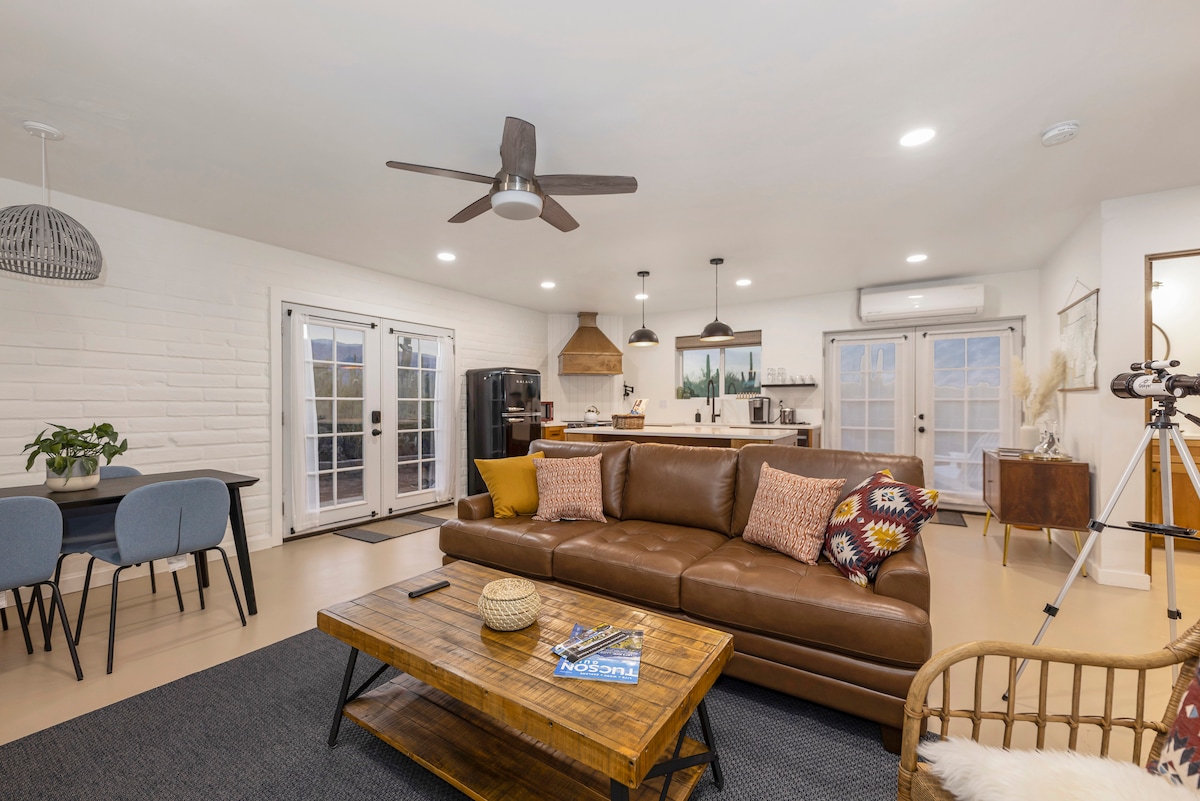 Contemporary Casita in Northeast Tucson, adjacent to Saguaro National Park East Located in the heart of the Sonoran Desert, this 1B/1B casita offers stunning mountain views and a peaceful desert setting. Just steps from SNP trails and a short drive to shops, restaurants and bars, it’s the perfect retreat The casita features a new, fully equipped kitchen, BBQ, and private patio with a telescope for stargazing. The cozy bedroom includes a queen-size bed and climate control for ultimate comfort