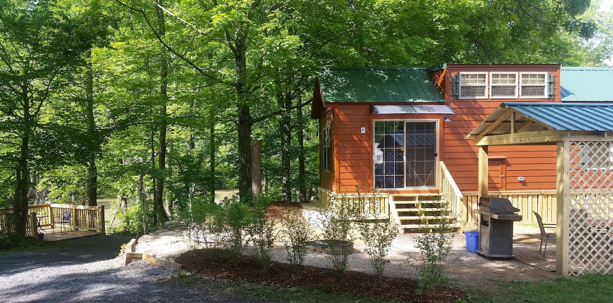 This small and cozy 1 br cabin, with a dining deck overlooking the Greenbrier River, is our smallest cabin. Perfect for 2 but you can use the couch futon to sleep a third (recommended for a child) This cabin has a large outdoor area surrounded by a privacy fence and a screened-in front porch. For additional charges ($50 + $100 refundable deposit) you can add the private Hot Tub. Arrange additional charges upon check in at the office.