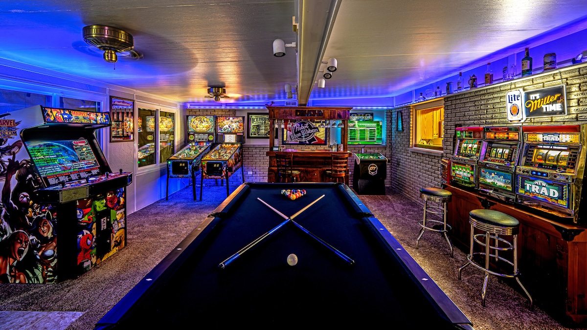 Relax in Style at Our Spacious Entertainment Retreat The space comfortably sleeps up to 8 guests, with two king-size beds a Queen Bed and a pull out sleeper sofa with memory foam mattress. Unwind after a long day in our luxurious Hot Tub or rejuvenate in the sauna and massage chair. Enjoy endless fun in the fully equipped game room with brand-new pinball machines, a pool table, slot machines, Golden Tee, and a Multicade arcade system with over 5,000 games — all free to play!