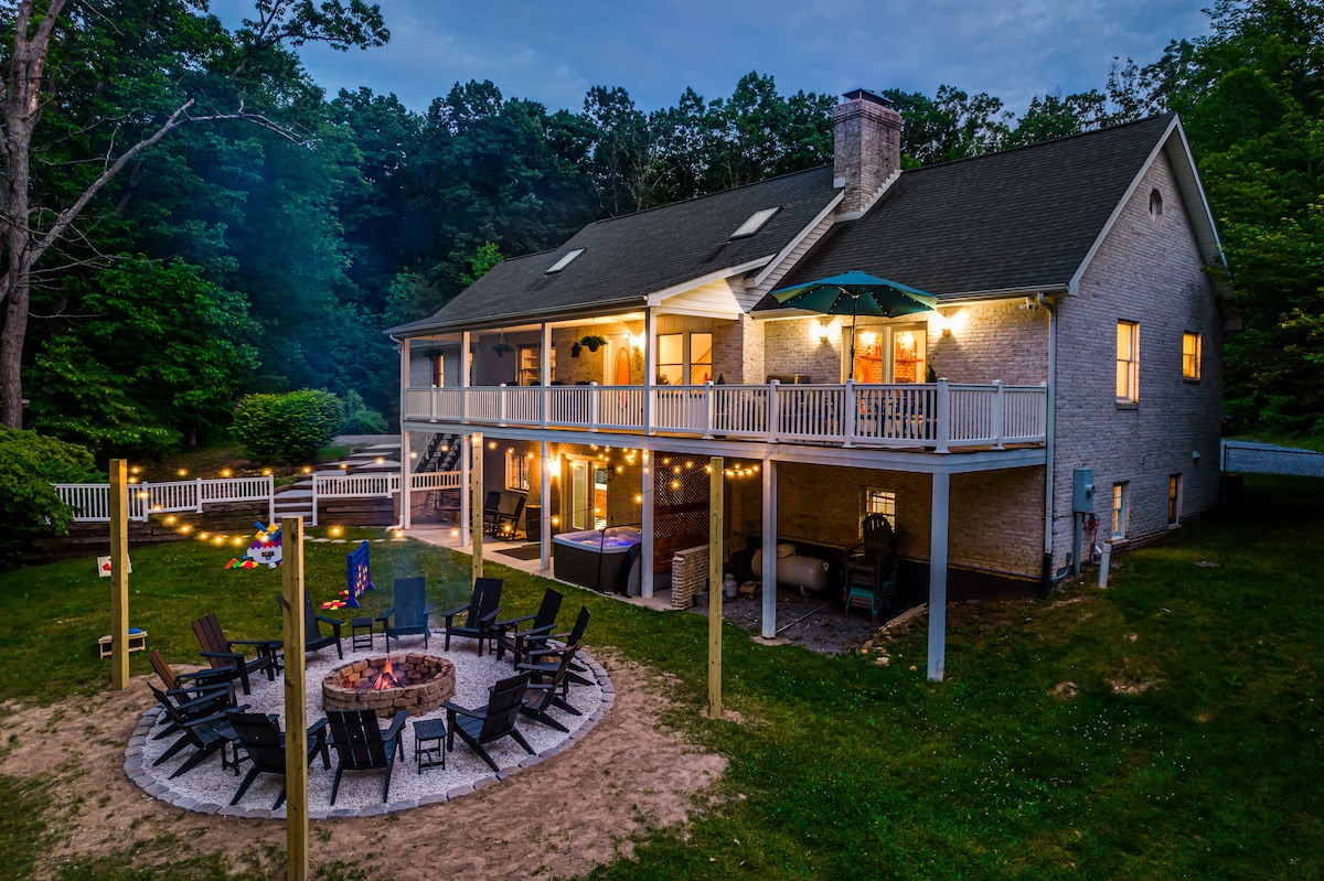• Our chalet is a quirky, slightly rustic house for a family or a small group. • 17 min. from Shenandoah NP, 32 min. from Massanutten Ski Resort, and near many vineyards. • Hot tub, dog friendly, fire pit, basement game room, large decks, and a campground style charcoal grill. • Pool table, air hockey, tabletop retro video game console and corn hole. 65" Roku TV with a Dolby Atmos Soundbar and a Blu-Ray player. • Gigabit fiber internet for super fast streaming video and audio.