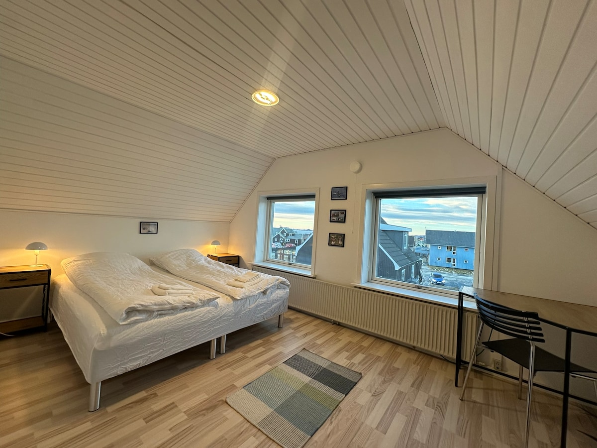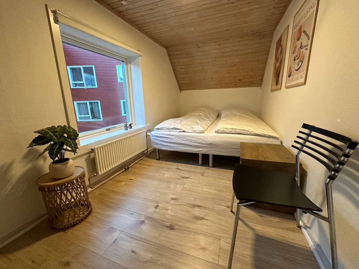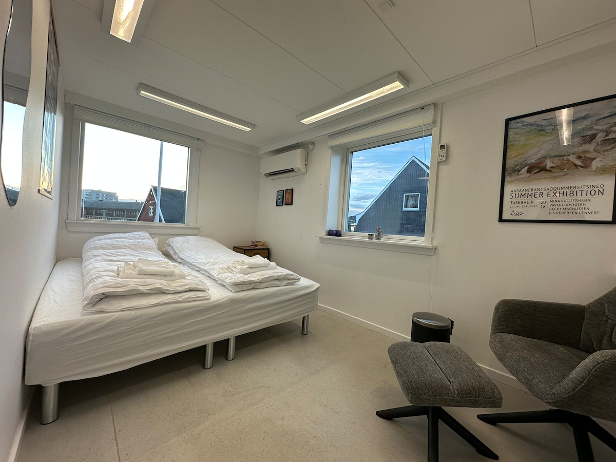 Værelse C Hyggeligt guesthouse midt i Nuuk centrum med gåafstand til caféer, restauranter, butikker og den gamle kolonihavn. Værelserne er komfortable og lyst indrettet, og du har adgang til fælles stue/køkken og badeværelse. Perfekt base for både solorejsende, par, forretningsfolk og grupper, der ønsker at opleve Grønlands hovedstad fra en central og hjemlig ramme. I perioden 9.-16. oktober 2025, bliver køkkenet flyttet til fællesrummet, og værelset bliver udstyret med en dobbeltseng.
