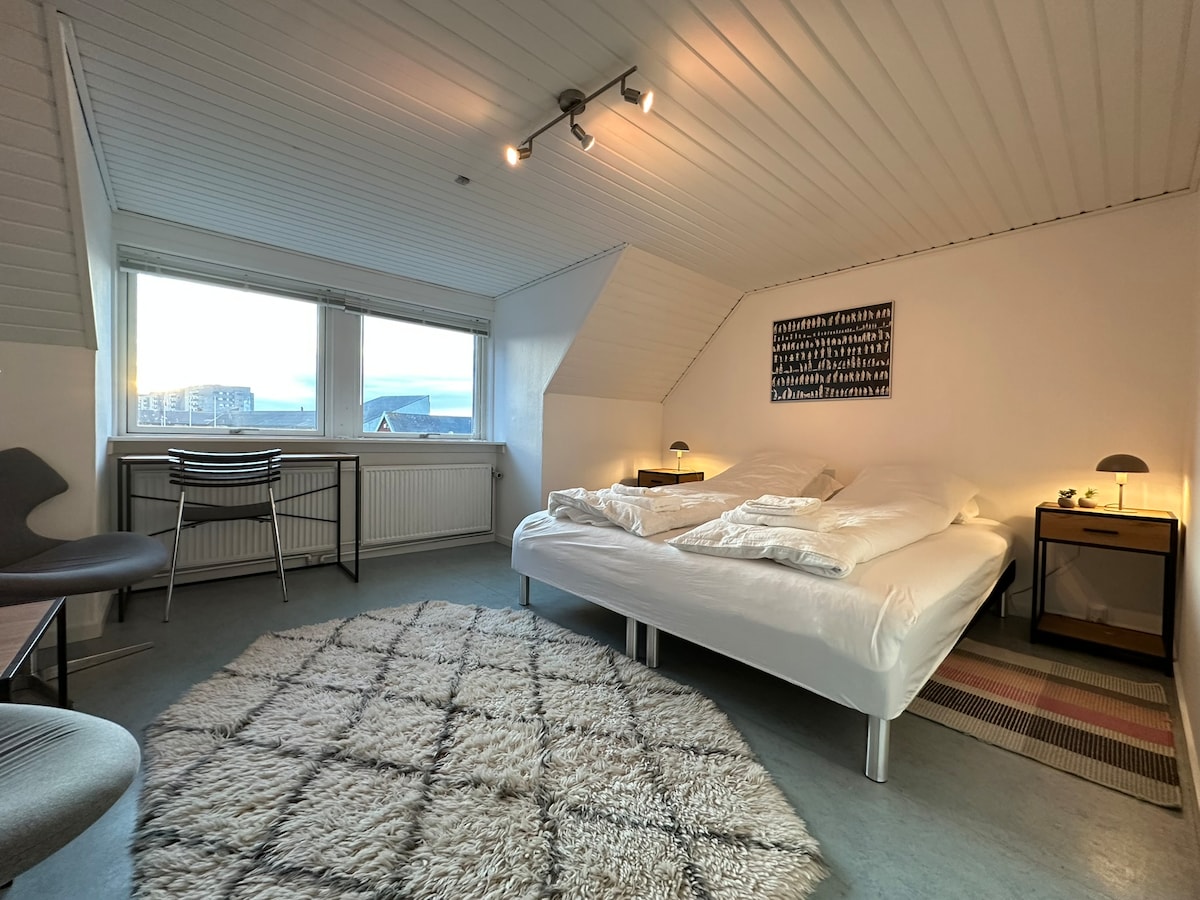 Værelse D Hyggeligt guesthouse midt i Nuuk centrum med gåafstand til caféer, restauranter, butikker og den gamle kolonihavn. Værelserne er komfortable og lyst indrettet, og du har adgang til fælles stue/køkken og badeværelse. Perfekt base for både solorejsende, par, forretningsfolk og grupper, der ønsker at opleve Grønlands hovedstad fra en central og hjemlig ramme. OBS! 9.-16. oktober 2025, vil køkkenet fra 1. sal, blive flyttet til fællesrummet. Der vil gå håndværker i huset i perioden.
