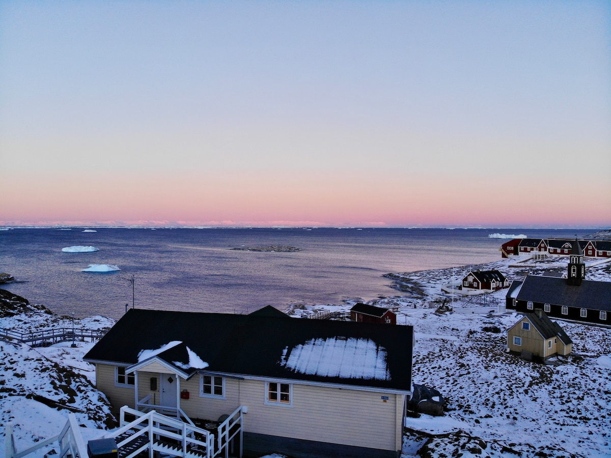 Oplev magien i Ilulissat fra Sea & City View Guesthouse! Vores gæstehus byder på en uforglemmelig udsigt over både Diskobugten og den charmerende bymidte, lige fra stuen. Med en central beliggenhed er du tæt på områdets mest spektakulære naturoplevelser og kulturelle seværdigheder. Huset er fuldt udstyret og skaber en hyggelig base, uanset om du er her for at opleve midnatssolen, nordlyset eller de imponerende isfjelde. Book hos os og få en autentisk grønlandsk oplevelse.