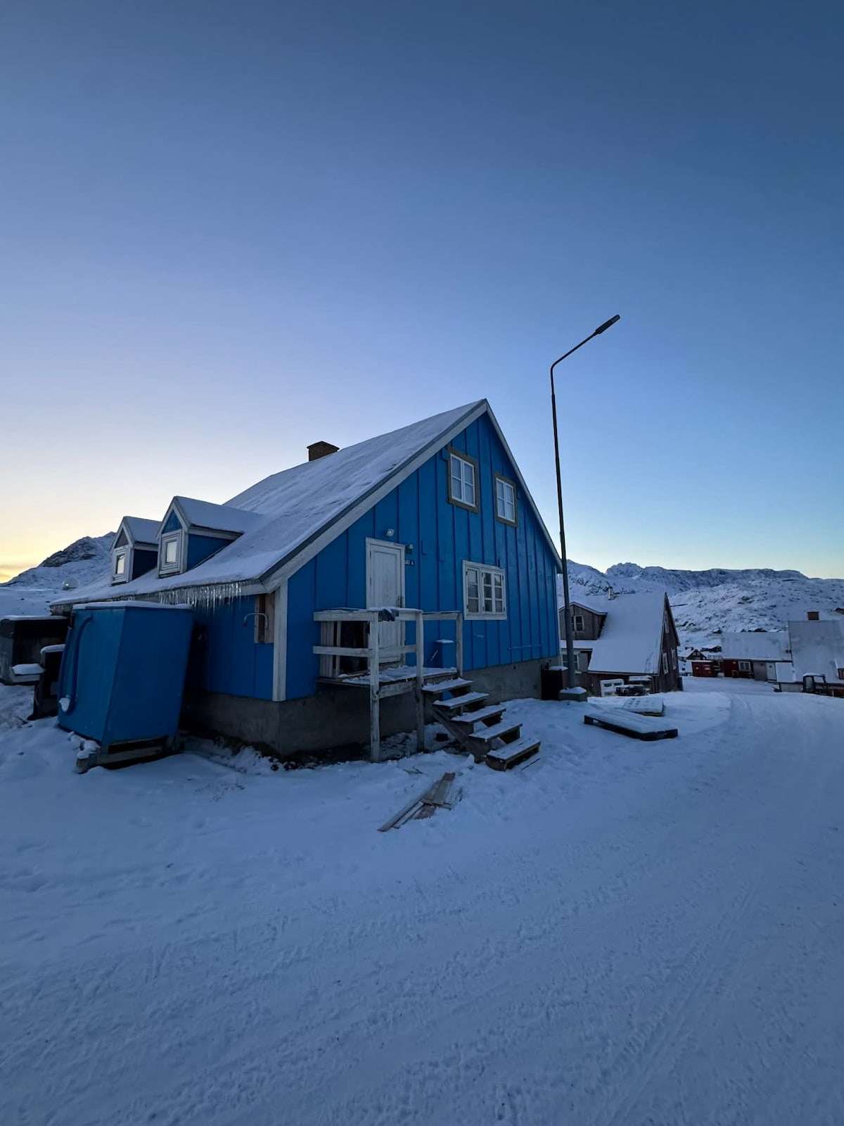 A charming house with an amazing picture-window view of a fjord filled with icebergs. The perfect nest for two people. Full kitchen, bedroom with rooftop window, fold-out couch & table in front room. Large, multi-lingual library. Wooden deck has a view of the ice cap. Electric heater for cooler days. Hot and cold running water in the kitchen. Cold water only in WC sink. Bathroom has a composting toilet and no shower.