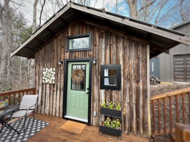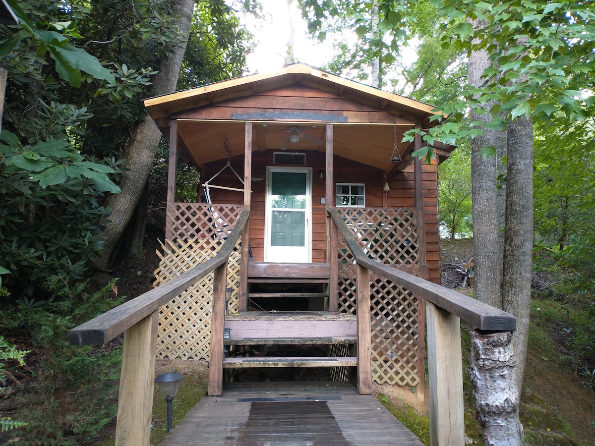This rustic 2 bedroom 1 1/2 bath cabin is nestled in the peaceful woods for a perfect mountain get away. Cabin is the perfect place for families, we include an upstairs playroom with a game table, books, and toys. We also provide an outdoor grill, large porch, and lots of outdoor seating that will provide the best ways to enjoy nature.The cabin is relatively close to two tiny houses but still offers a sense of privacy.