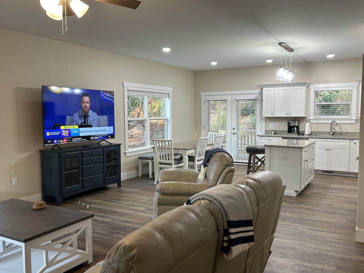 This is our 2nd Airbnb at our same mountain top location overlooking Western Carolina University and Cullowhee NC. Listed as being in the top 1% of All Airbnb based on customer satisfaction. The apartment is a 1965 square foot 2-bedroom with a king-size bed in each bedroom. A full kitchen, a very large living dining kitchen area, a private patio, a gas log fireplace, huge TVs, and a jaw-dropping view of WCU and Cullowhee NC and yes a killer hot tub to soak in the view. The best of everything!
