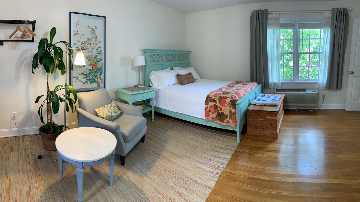 This tranquil & quiet studio is nestled in Starmount. The calming interior is perfect for relaxing and recharging your batteries. This loft boasts a king size bed, kitchenette, Wifi, 47" flatscreen TV for either watching in bed or lounging on the sofa. If you want to work, a desk is there for you to spread out. Relax in the gorgeous courtyard, dining area or in front of the fireplace. Better yet, enjoy the "secret garden". Perfectly located in central GSO which is close to shopping & downtown.